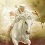 Jesus och hans änglar rider på vita hästar i Harmageddon.
