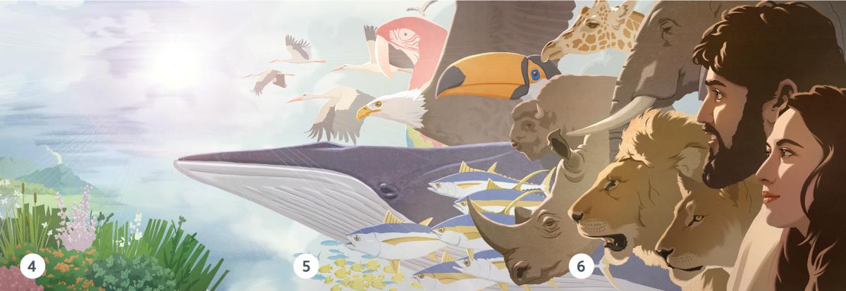 ปฐมกาล 1:20-27 บอกให้รู้ว่าสิ่งมีชีวิตชนิดแรกที่ถูกสร้างคือปลา จากนั้นก็นก ต่อมาก็เป็นสัตว์บก และสุดท้ายคือมนุษย์ นักวิทยาศาสตร์ก็เชื่อว่าปลาตัวแรกเกิดขึ้นมานานก่อนสัตว์เลี้ยงลูกด้วยนมตัวแรก และหลังจากนั้นอีกนานถึงค่อยมีมนุษย์