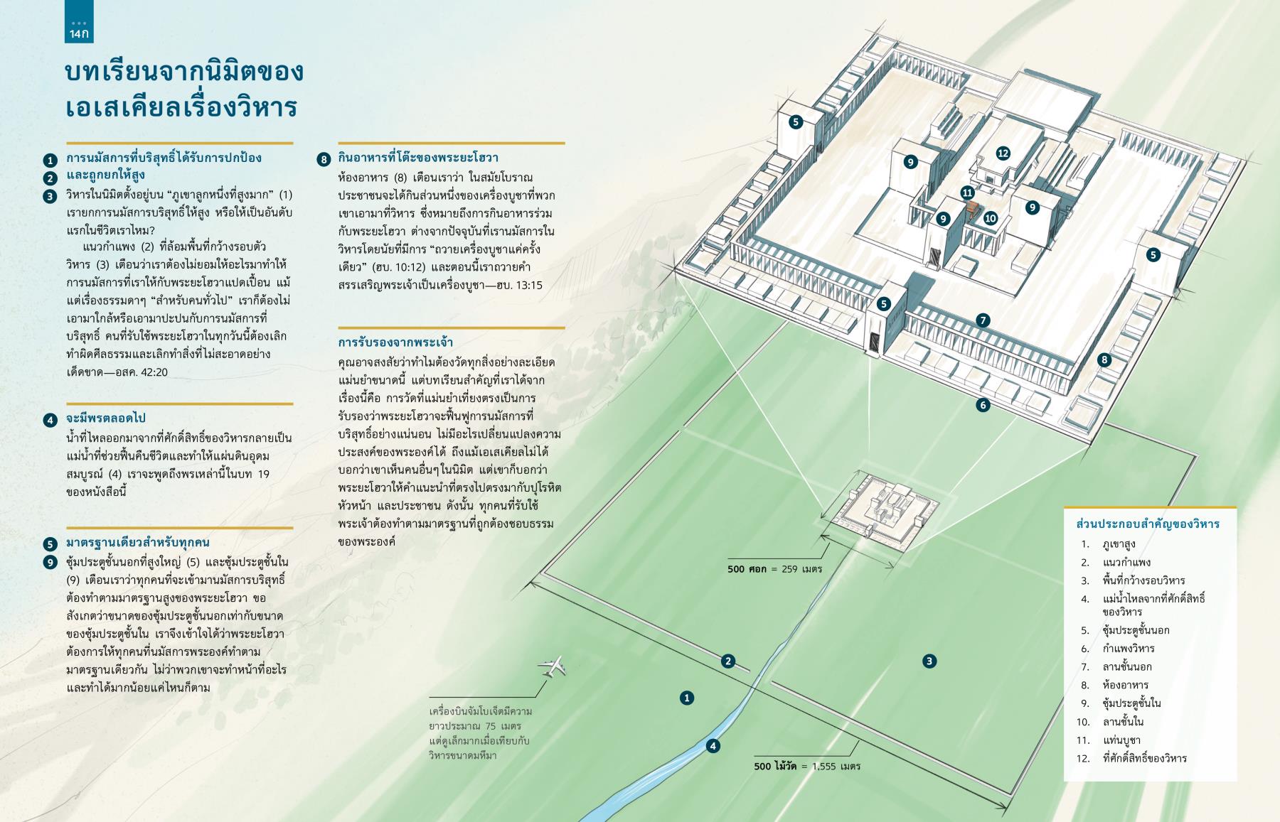 วิหารในนิมิตตั้งอยู่บน “ภูเขาลูกหนึ่งที่สูงมาก” (1) เรายกการนมัสการบริสุทธิ์ให้สูง หรือให้เป็นอันดับแรกในชีวิตเราไหม? แนวกำแพง (2) ที่ล้อมพื้นที่กว้างรอบตัววิหาร (3) เตือนว่าเราต้องไม่ยอมให้อะไรมาทำให้การนมัสการที่เราให้กับพระยะโฮวาแปดเปื้อน แม้แต่เรื่องธรรมดา ๆ “สำหรับคนทั่วไป” เราก็ต้องไม่เอามาใกล้หรือเอามาปะปนกับการนมัสการที่บริสุทธิ์ คนที่รับใช้พระยะโฮวาในทุกวันนี้ต้องเลิกทำผิดศีลธรรมและเลิกทำสิ่งที่ไม่สะอาดอย่างเด็ดขาด—อสค. 42:20