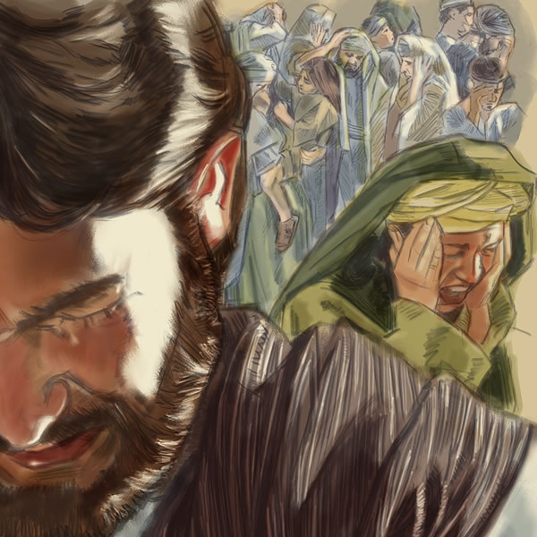 มาเรียออกไปหาพระเยซูทันที. แต่ฝูงชนคิดว่าเธอกำลังจะไปอุโมงค์ฝังศพจึงตามเธอไปด้วย. เมื่อพระเยซูเห็นมาเรียกับฝูงชนที่มาด้วยพากันร้องไห้พระองค์ก็ทรงร้องไห้ด้วย. ไม่ช้า ทั้งหมดก็มาถึงอุโมงค์ฝังศพซึ่งมีหินก้อนใหญ่ปิดอยู่. พระเยซูสั่งว่า “เอาหินออกไปเถิด.” แต่มาร์ทาคัดค้านว่า “พระองค์เจ้าข้า ตอนนี้ศพคงมีกลิ่นเหม็นเพราะตายมาสี่วัน แล้ว.”