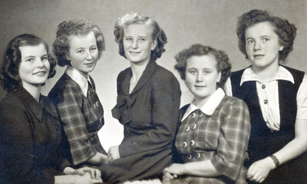 จากซ้าย: อีวา คัลลิโอ, ไซมิ มัตตีลา-ไซร์จาลา, ไอลิ, อันนิกคิ, และซารา โนโปเนน ในปี 1949