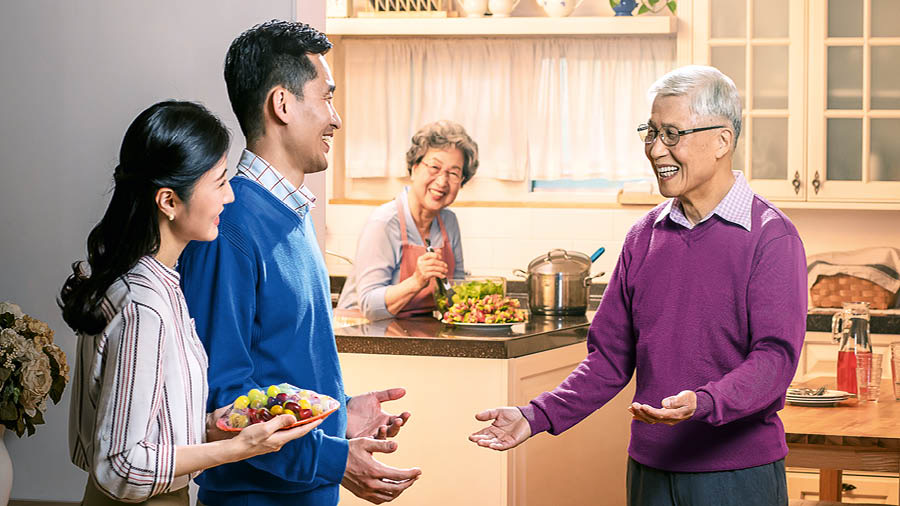 b คำอธิบายภาพ ผู้ดูแลที่อายุน้อยกว่าได้ประโยชน์จากประสบการณ์ของผู้ดูแลที่อายุมากกว่า เขาพูดสิ่งที่เขาได้เรียนรู้จากผู้ดูแลคนนั้น ผู้ดูแลที่อายุมากกว่ากับภรรยาชวนผู้ดูแลที่อายุน้อยกว่ากับภรรยามาที่บ้าน