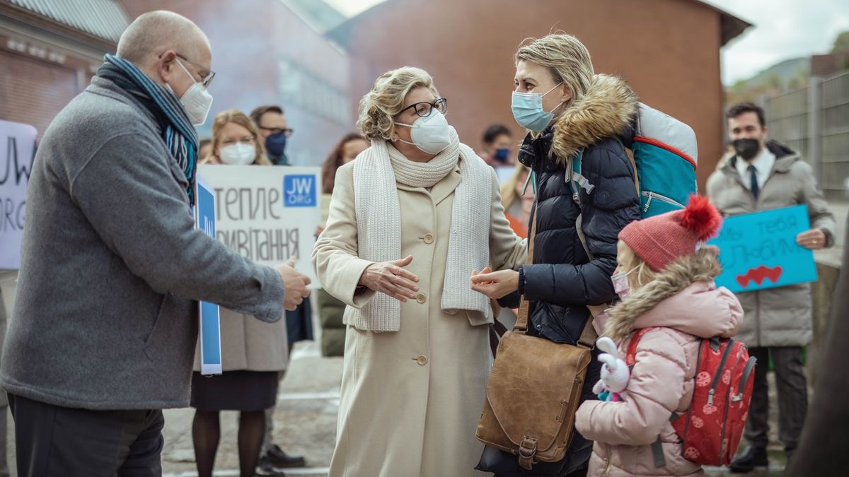 d መግለጺ ስእሊ፦ ሓንቲ ኣደን ጓላን ካብ ዓደን ተሰዲደን ናብ ካልእ ዓዲ ይኸዳ። ክርስትያናት ብጾተን ሓንጐፋይ ኢሎም ይቕበልወን፡ ግብራዊ ሓገዝ እውን ይህብወን።