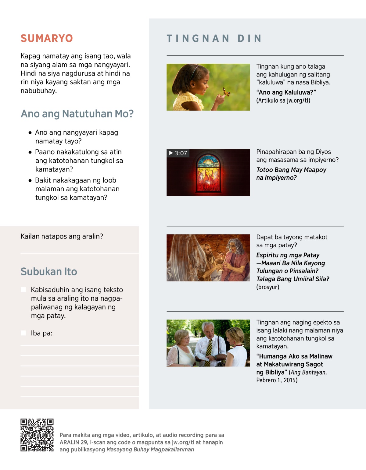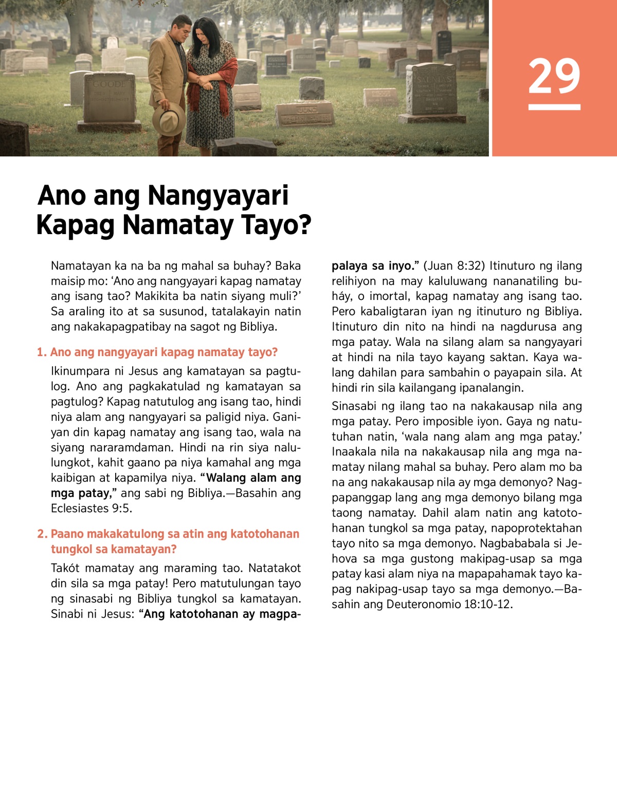 Alamin pa ang itinuturo ng Bibliya tungkol sa kamatayan. Patibayin ang pananampalataya mo sa ating Diyos na mapagmahal at hindi nagpapahirap sa mga patay.