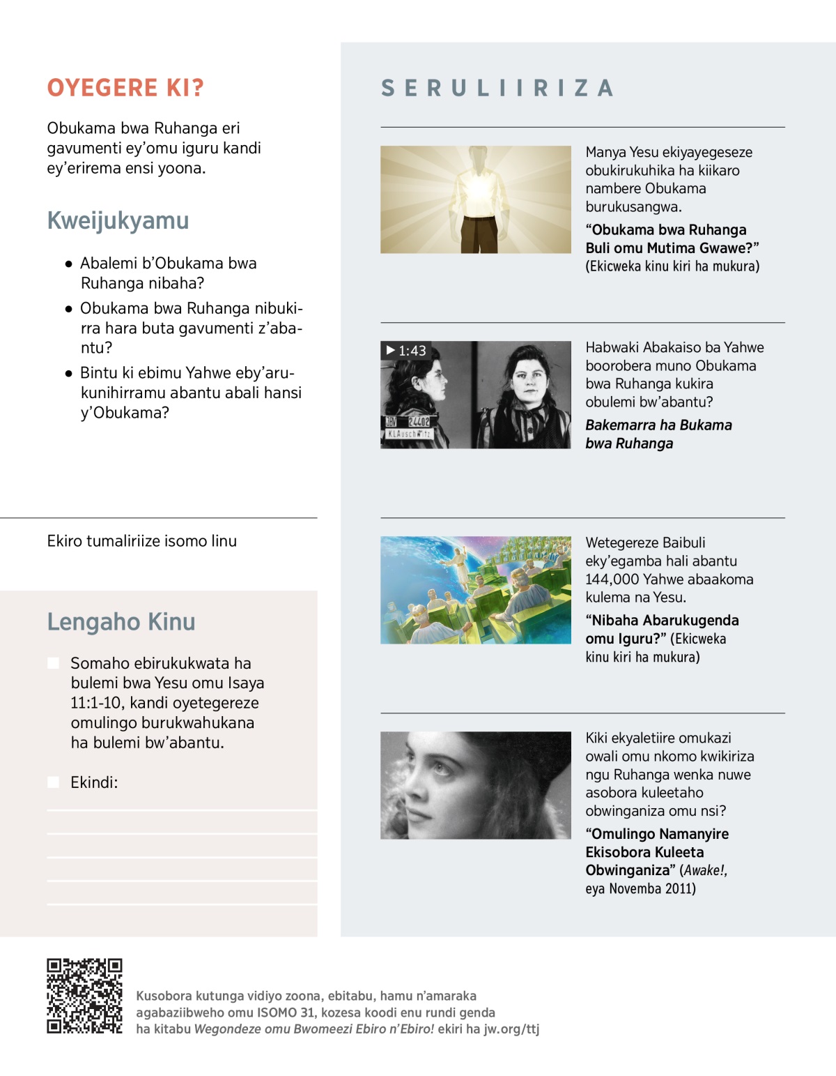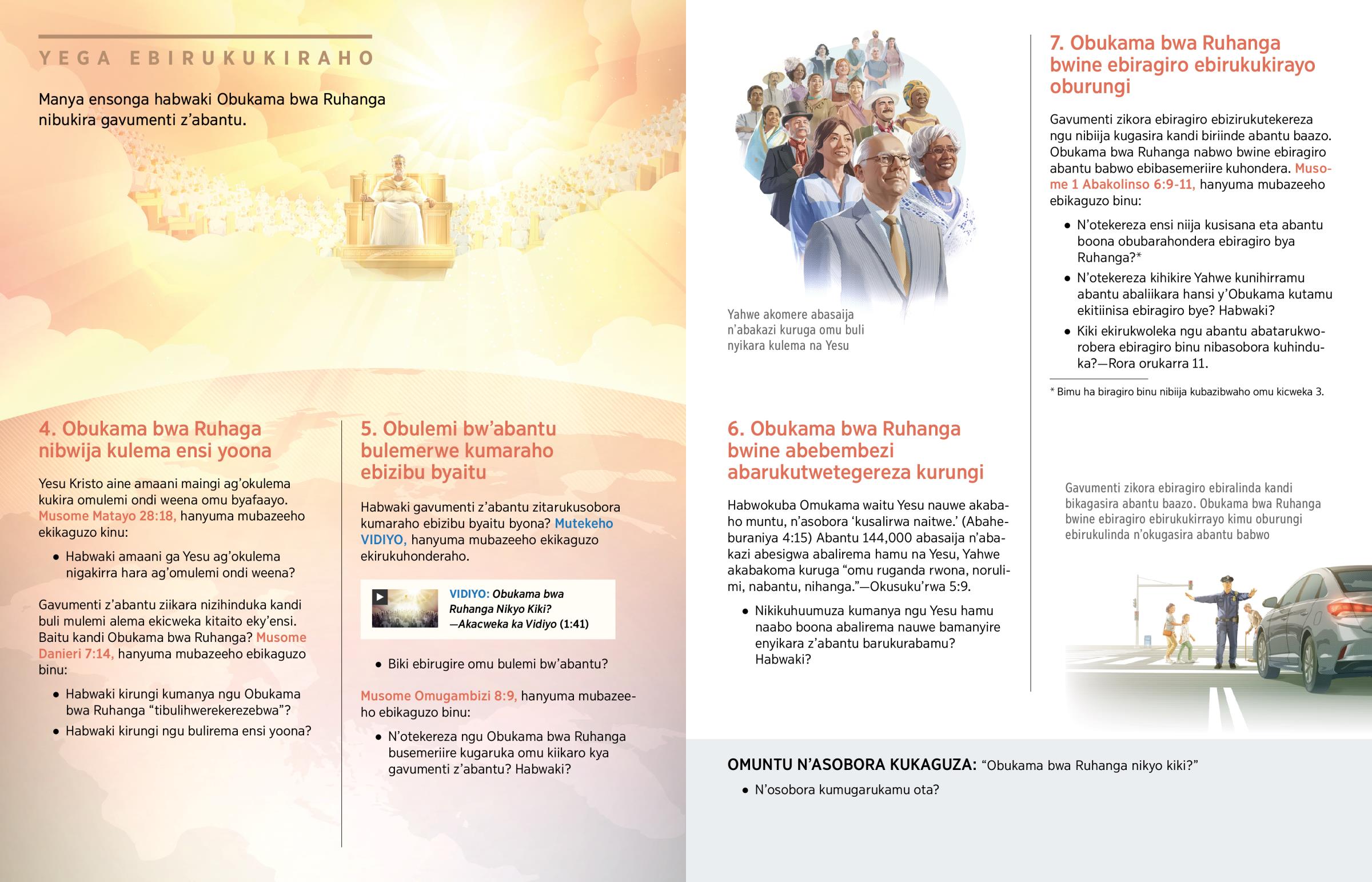 Obutumwa oburukukirayo obukuru omu Baibuli nibukwata ha Bukama bwa Ruhanga. Yahwe naija kukozesa Obukama obu kuhikiriza ekigendererwa kye hali ensi. Obukama nikyo kiki? Nitumanya tuta ngu buliyo nibulema kasumi kanu? Bintu ki ebibumazire kuhikiriza? Kandi nibwija kukora ki omu kasumi ak’omu maiso? Isomo linu hamu n’amasomo abiri agarukuhonderaho nigaija kugarukamu ebikaguzo ebi.
