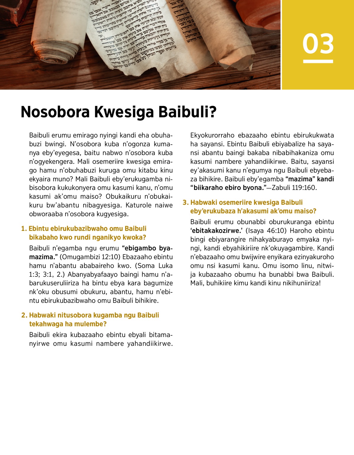 Baibuli erumu emirago nyingi kandi eha obuhabuzi bwingi. N’osobora kuba n’ogonza kumanya eby’eyegesa, baitu nabwo n’osobora kuba n’ogyekengera. Mali osemeriire kwesiga emirago hamu n’obuhabuzi kuruga omu kitabu kinu ekyaira muno? Mali Baibuli eby’erukugamba nibisobora kukukonyera omu kasumi kanu, n’omu kasumi ak’omu maiso? Obukaikuru n’obukaikuru bw’abantu nibagyesiga. Katurole naiwe obworaaba n’osobora kugyesiga.