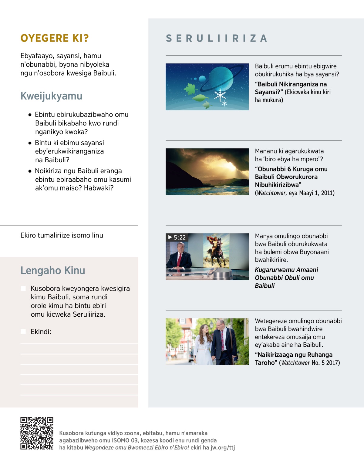 Baibuli erumu obunabbi oburukuranga ebintu ‘ebitakakozirwe.’ (Isaya 46:10) Haroho ebintu bingi ebiyarangire nihakyaburayo emyaka nyingi, kandi ebyahikiriire nk’okuyagambire. Kandi n’ebazaaho omu bwijwire enyikara ezinyakuroho omu nsi kasumi kanu. Omu isomo linu, nitwija kubazaaho obumu ha bunabbi bwa Baibuli. Mali, buhikiire kimu kandi kinu nikihuniiriza!