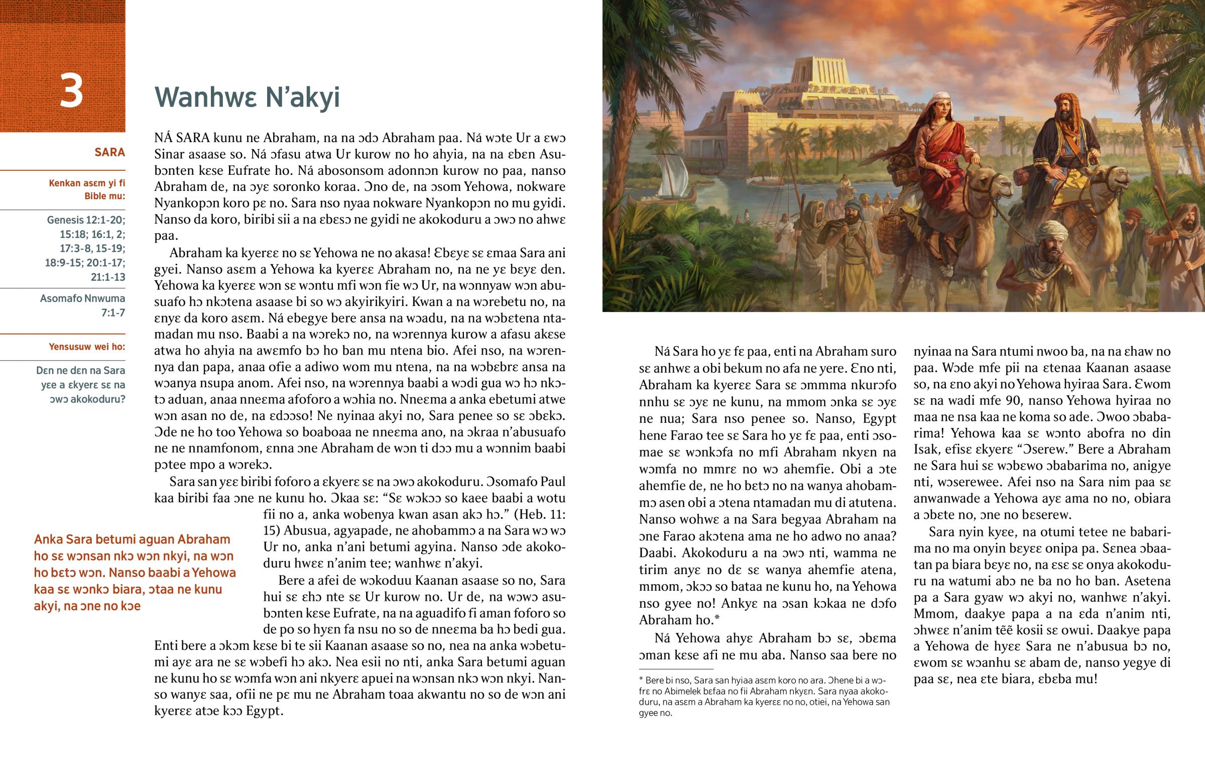 Abraham ka kyerɛɛ no sɛ Yehowa ne no akasa! Ɛbɛyɛ sɛ ɛmaa Sara ani gyei. Nanso asɛm a Yehowa ka kyerɛɛ Abraham no, na ne yɛ bɛyɛ den. Yehowa ka kyerɛɛ wɔn sɛ wɔntu mfi wɔn fie wɔ Ur, na wɔnnyaw wɔn abusuafo hɔ nkɔtena asaase bi so wɔ akyirikyiri. Kwan a na wɔrebetu no, na ɛnyɛ da koro asɛm. Ná ebegye bere ansa na wɔadu, na na wɔbɛtena ntamadan mu nso. Baabi a na wɔrekɔ no, na wɔrennya kurow a afasu akɛse atwa ho ahyia na awɛmfo bɔ ho ban mu ntena bio. Afei nso, na wɔrennya dan papa, anaa ofie a adiwo wom mu ntena, na na wɔbɛbrɛ ansa na wɔanya nsupa anom. Afei nso, na wɔrennya baabi a wɔdi gua wɔ hɔ nkɔtɔ aduan, anaa nneɛma afoforo a wɔhia no. Nneɛma a anka ebetumi atwe wɔn asan no de, na ɛdɔɔso! Ne nyinaa akyi no, Sara penee so sɛ ɔbɛkɔ. Ɔde ne ho too Yehowa so boaboaa ne nneɛma ano, na ɔkraa n’abusuafo ne ne nnamfonom, ɛnna ɔne Abraham de wɔn ti dɔɔ mu a wɔnnim baabi pɔtee mpo a wɔrekɔ.
