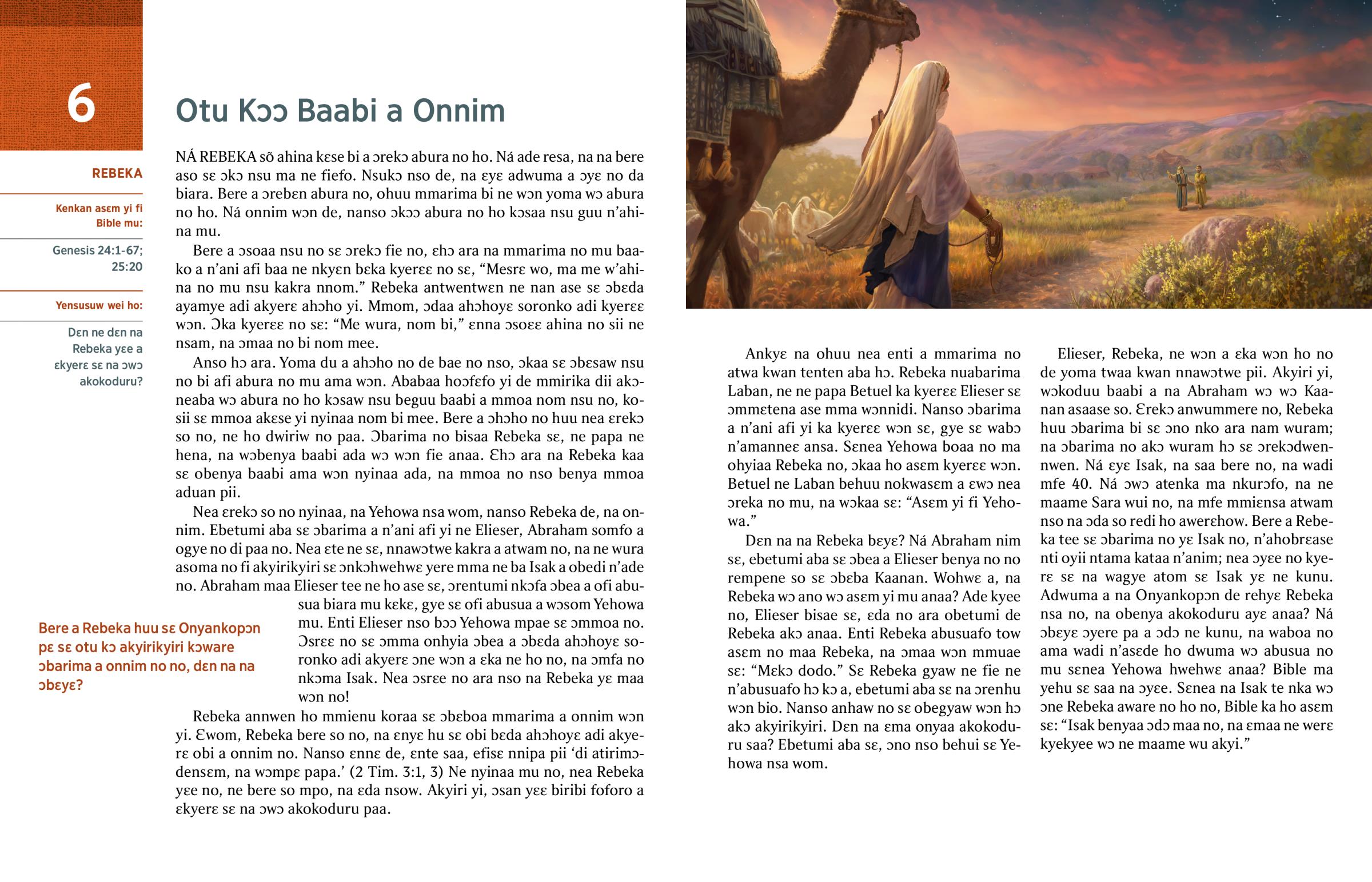 Elieser, Rebeka, ne wɔn a ɛka wɔn ho no de yoma twaa kwan nnawɔtwe pii. Akyiri yi, wɔkoduu baabi a na Abraham wɔ wɔ Kaanan asaase so. Ɛrekɔ anwummere no, Rebeka huu ɔbarima bi sɛ ɔno nko ara nam wuram; na ɔbarima no akɔ wuram hɔ sɛ ɔrekɔdwennwen. Ná ɛyɛ Isak, na saa bere no, na wadi mfe 40. Ná ɔwɔ atenka ma nkurɔfo, na ne maame Sara wui no, na mfe mmiɛnsa atwam nso na ɔda so redi ho awerɛhow. Bere a Rebeka tee sɛ ɔbarima no yɛ Isak no, n’ahobrɛase nti oyii ntama kataa n’anim; nea ɔyɛe no kyerɛ sɛ na wagye atom sɛ Isak yɛ ne kunu. Adwuma a na Onyankopɔn de rehyɛ Rebeka nsa no, na obenya akokoduru ayɛ anaa? Ná ɔbɛyɛ ɔyere pa a ɔdɔ ne kunu, na waboa no ama wadi n’asɛde ho dwuma wɔ abusua no mu sɛnea Yehowa hwehwɛ anaa? Bible ma yehu sɛ saa na ɔyɛe. Sɛnea na Isak te nka wɔ ɔne Rebeka aware no ho no, Bible ka ho asɛm sɛ: “Isak benyaa ɔdɔ maa no, na ɛmaa ne werɛ kyekyee wɔ ne maame wu akyi.”