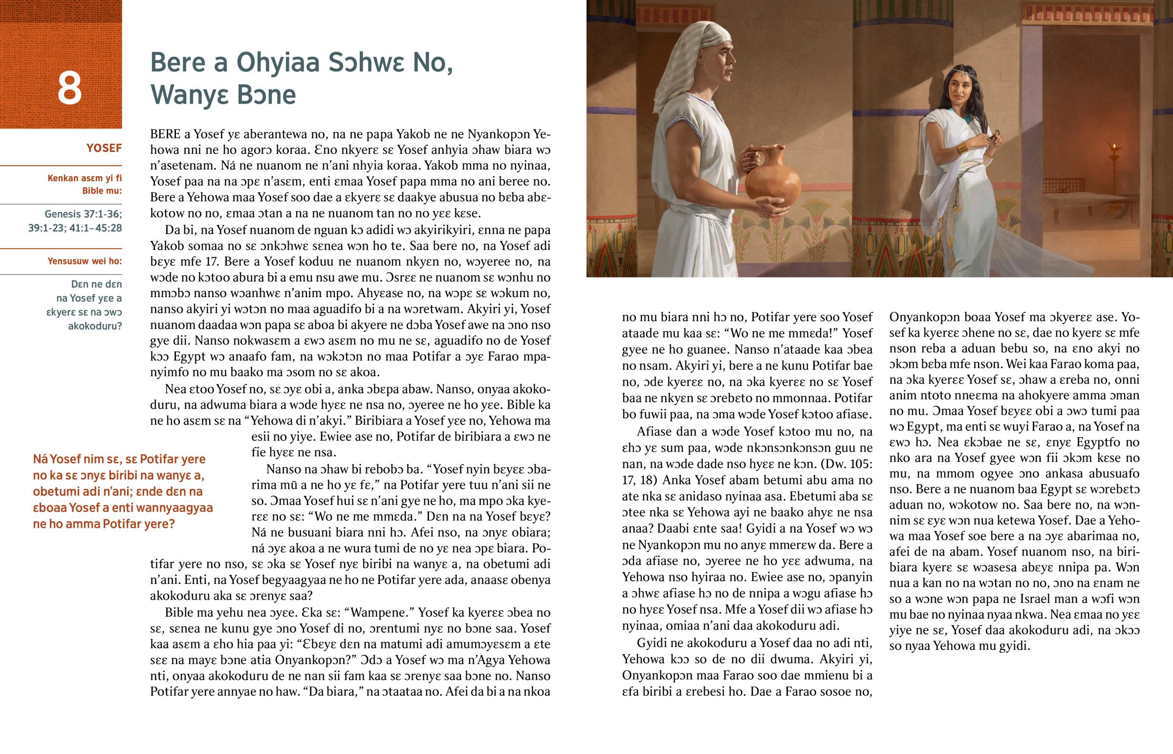 Bible ma yehu nea ɔyɛe. Ɛka sɛ: “Wampene.” Yosef ka kyerɛɛ ɔbea no sɛ, sɛnea ne kunu gye ɔno Yosef di no, ɔrentumi nyɛ no bɔne saa. Yosef kaa asɛm a ɛho hia paa yi: “Ɛbɛyɛ dɛn na matumi adi amumɔyɛsɛm a ɛte sɛɛ na mayɛ bɔne atia Onyankopɔn?” Ɔdɔ a Yosef wɔ ma n’Agya Yehowa nti, onyaa akokoduru de ne nan sii fam kaa sɛ ɔrenyɛ saa bɔne no. Nanso Potifar yere annyae no haw. “Da biara,” na ɔtaataa no. Afei da bi a na nkoa no mu biara nni hɔ no, Potifar yere soo Yosef ataade mu kaa sɛ: “Wo ne me mmɛda!” Yosef gyee ne ho guanee. Nanso n’ataade kaa ɔbea no nsam. Akyiri yi, bere a ne kunu Potifar bae no, ɔde kyerɛɛ no, na ɔka kyerɛɛ no sɛ Yosef baa ne nkyɛn sɛ ɔrebɛto no mmonnaa. Potifar bo fuwii paa, na ɔma wɔde Yosef kɔtoo afiase.