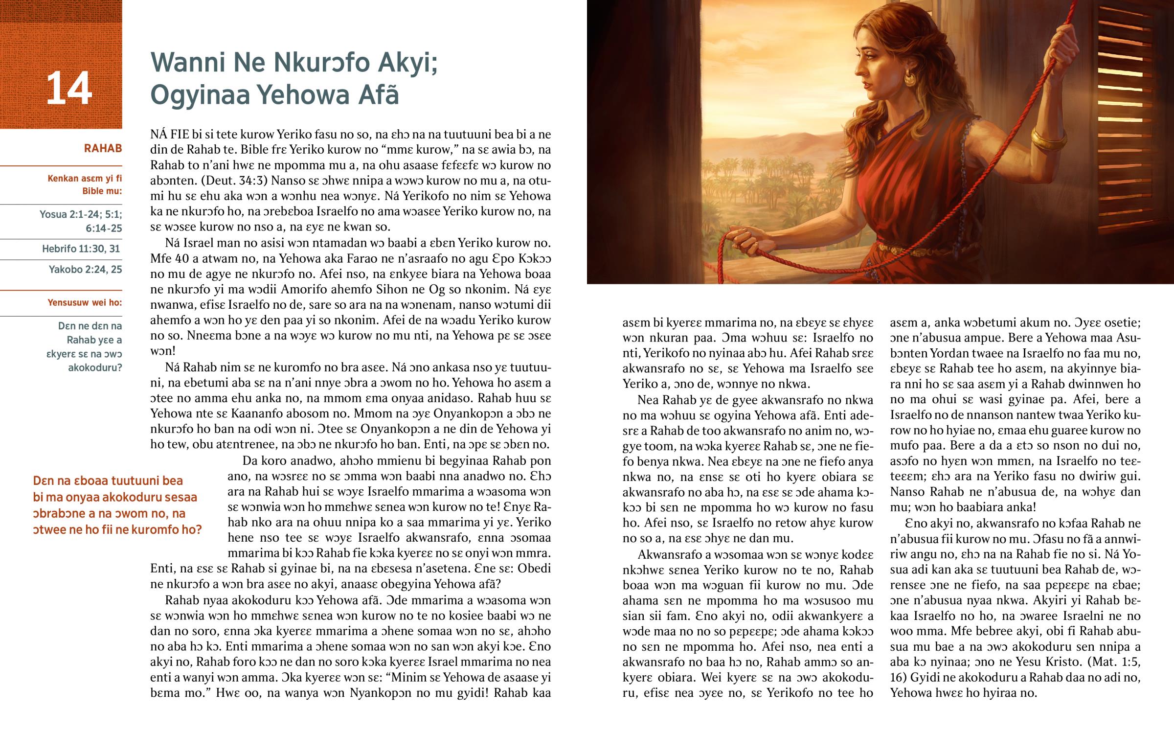 Akwansrafo a wɔsomaa wɔn sɛ wɔnyɛ kodɛɛ nkɔhwɛ sɛnea Yeriko kurow no te no, Rahab boaa wɔn ma wɔguan fii kurow no mu. Ɔde ahama sɛn ne mpomma ho ma wɔsusoo mu sian sii fam. Ɛno akyi no, odii akwankyerɛ a wɔde maa no no so pɛpɛɛpɛ; ɔde ahama kɔkɔɔ no sɛn ne mpomma ho. Afei nso, nea enti a akwansrafo no baa hɔ no, Rahab ammɔ so ankyerɛ obiara. Wei kyerɛ sɛ na ɔwɔ akokoduru, efisɛ nea ɔyɛe no, sɛ Yerikofo no tee ho asɛm a, anka wɔbetumi akum no. Ɔyɛɛ osetie; ɔne n’abusua ampue. Bere a Yehowa maa Asubɔnten Yordan twaee na Israelfo no faa mu no, ɛbɛyɛ sɛ Rahab tee ho asɛm, na akyinnye biara nni ho sɛ saa asɛm yi a Rahab dwinnwen ho no ma ohui sɛ wasi gyinae pa. Afei, bere a Israelfo no de nnanson nantew twaa Yeriko kurow no ho hyiae no, ɛmaa ehu guaree kurow no mufo paa. Bere a da a ɛtɔ so nson no dui no, asɔfo no hyɛn wɔn mmɛn, na Israelfo no teɛteɛɛm; ɛhɔ ara na Yeriko fasu no dwiriw gui. Nanso Rahab ne n’abusua de, na wɔhyɛ dan mu; wɔn ho baabiara anka!