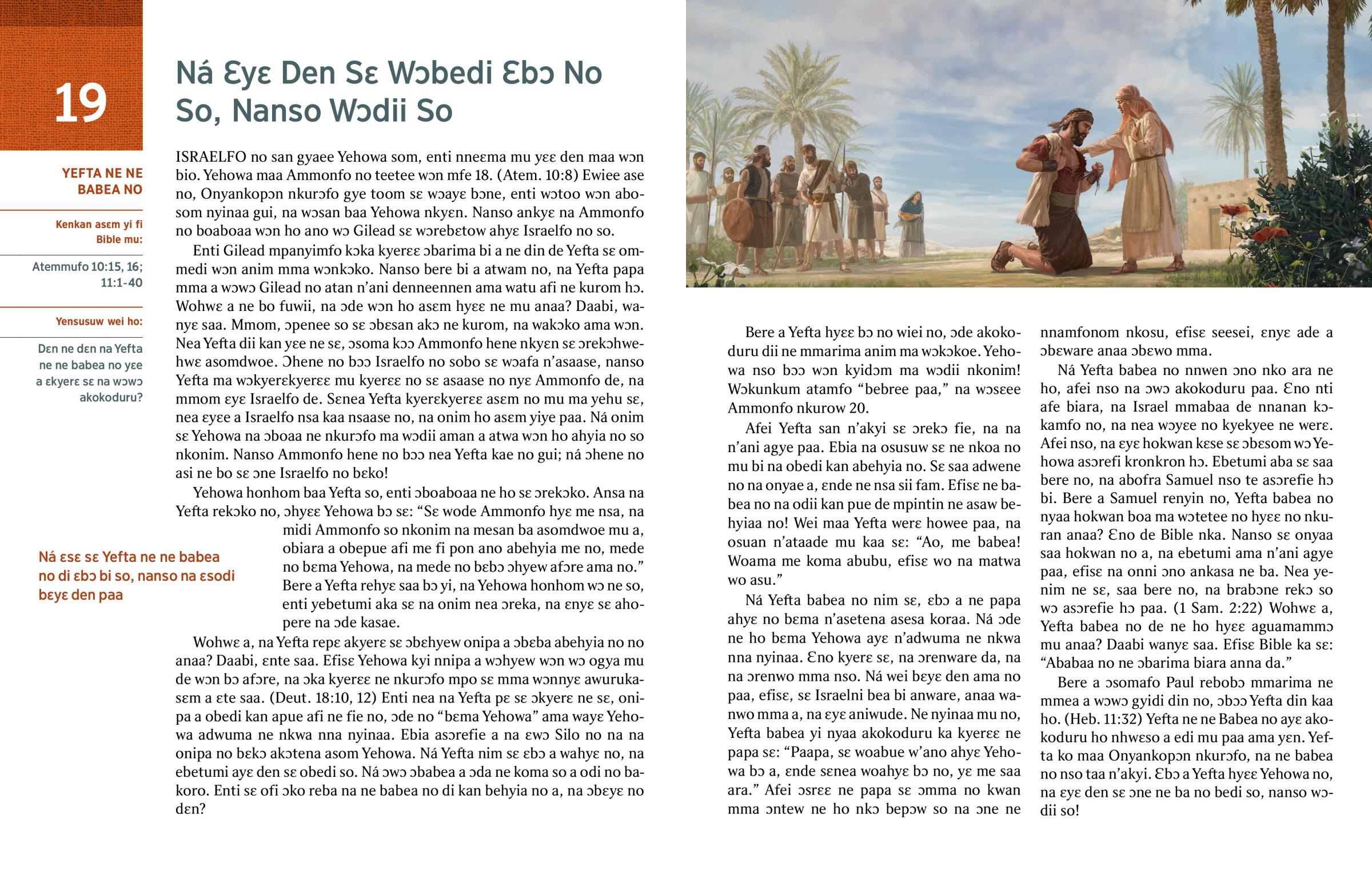 Ná Yefta babea no nim sɛ, ɛbɔ a ne papa ahyɛ no bɛma n’asetena asesa koraa. Ná ɔde ne ho bɛma Yehowa ayɛ n’adwuma ne nkwa nna nyinaa. Ɛno kyerɛ sɛ, na ɔrenware da, na na ɔrenwo mma nso. Ná wei bɛyɛ den ama no paa, efisɛ, sɛ Israelni bea bi anware, anaa wanwo mma a, na ɛyɛ aniwude. Ne nyinaa mu no, Yefta babea yi nyaa akokoduru ka kyerɛɛ ne papa sɛ: “Paapa, sɛ woabue w’ano ahyɛ Yehowa bɔ a, ɛnde sɛnea woahyɛ bɔ no, yɛ me saa ara.” Afei ɔsrɛɛ ne papa sɛ ɔmma no kwan mma ɔntew ne ho nkɔ bepɔw so na ɔne ne nnamfonom nkosu, efisɛ seesei, ɛnyɛ ade a ɔbɛware anaa ɔbɛwo mma.