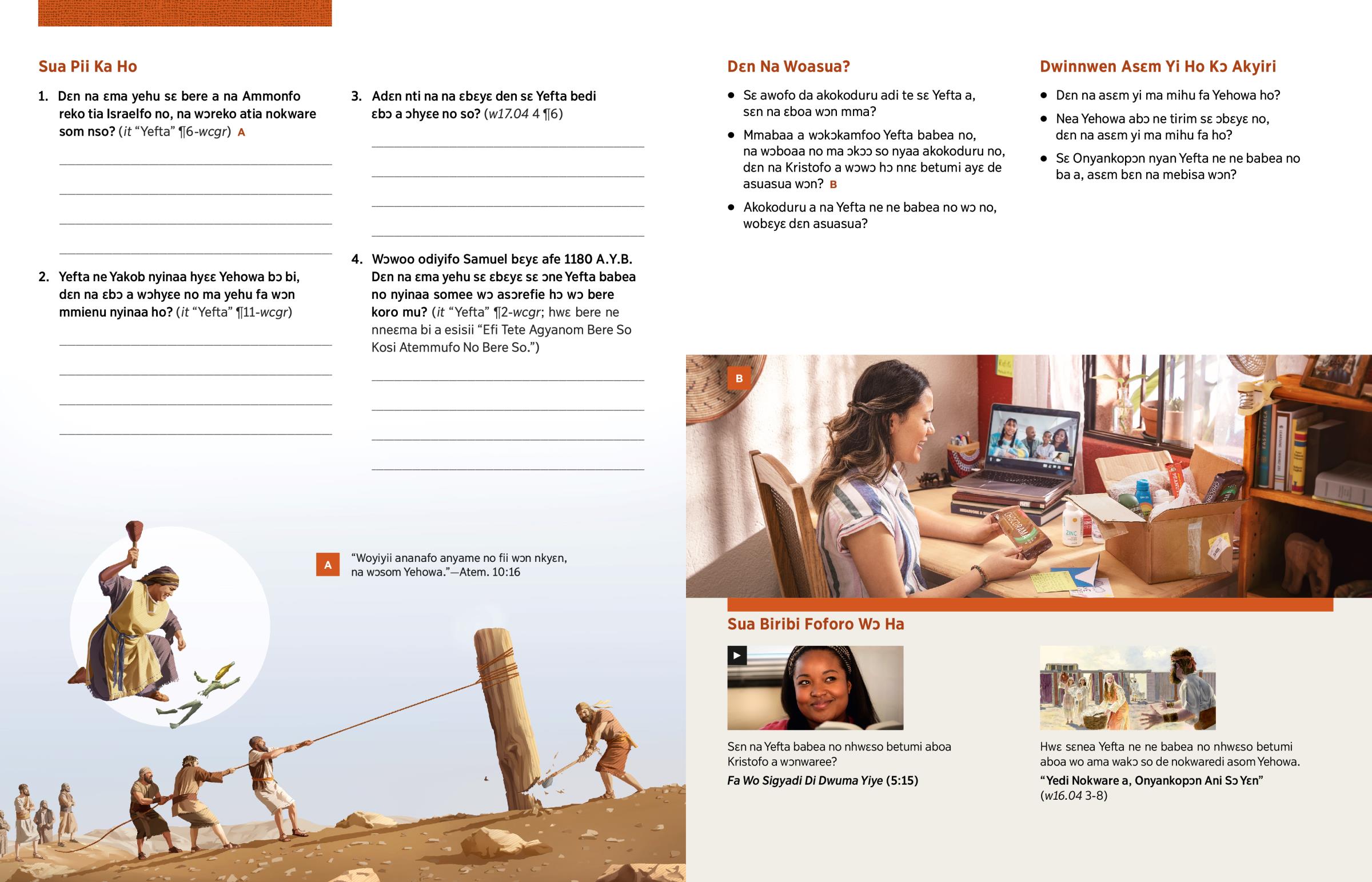 Mfoni A: “Woyiyii ananafo anyame no fii wɔn nkyɛn, na wɔsom Yehowa.”—Atem. 10:16