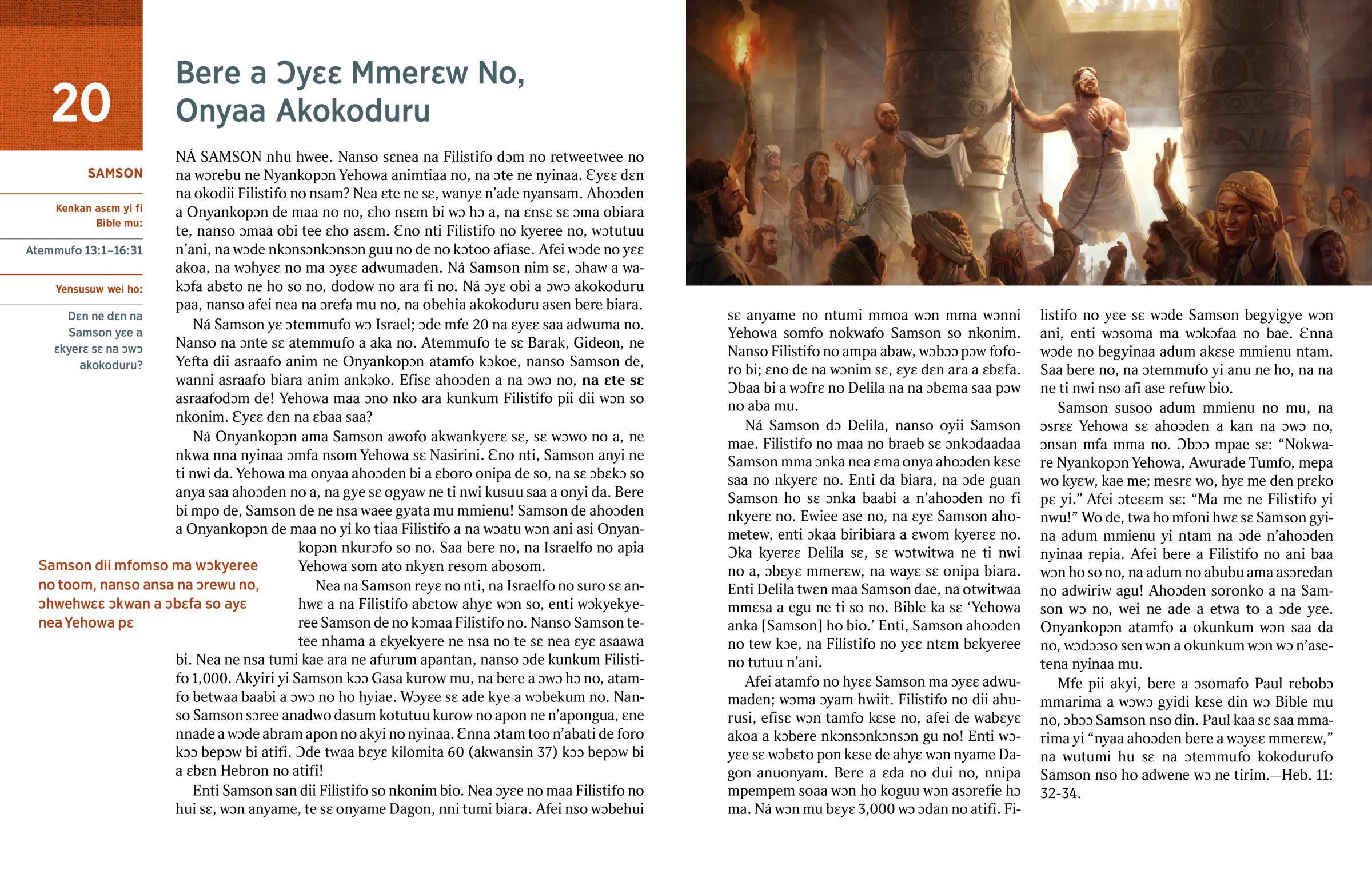 Ná Onyankopɔn ama Samson awofo akwankyerɛ sɛ, sɛ wɔwo no a, ne nkwa nna nyinaa ɔmfa nsom Yehowa sɛ Nasirini. Ɛno nti, Samson anyi ne ti nwi da. Yehowa ma onyaa ahoɔden bi a ɛboro onipa de so, na sɛ ɔbɛkɔ so anya saa ahoɔden no a, na gye sɛ ogyaw ne ti nwi kusuu saa a onyi da. Bere bi mpo de, Samson de ne nsa waee gyata mu mmienu! Samson de ahoɔden a Onyankopɔn de maa no yi ko tiaa Filistifo a na wɔatu wɔn ani asi Onyankopɔn nkurɔfo so no. Saa bere no, na Israelfo no apia Yehowa som ato nkyɛn resom abosom.