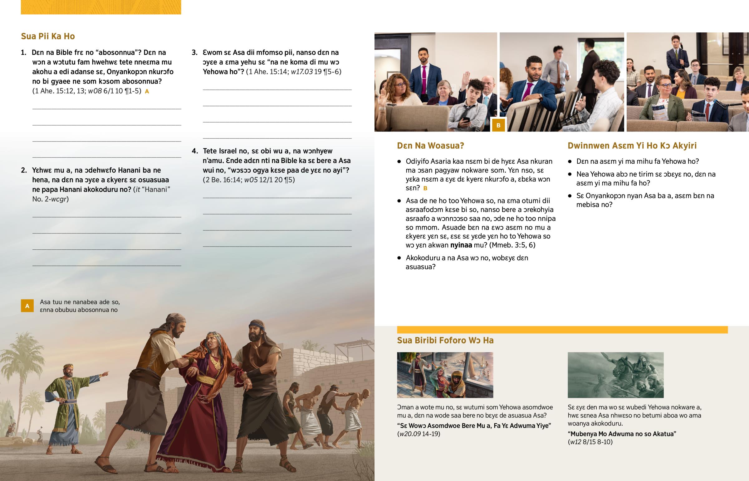 2. 3. Ɛwom sɛ Asa dii mfomso pii, nanso dɛn na ɔyɛe a ɛma yehu sɛ “na ne koma di mu wɔ Yehowa ho”? (1 Ahe. 15:14; w17.03 19 ¶5-6)