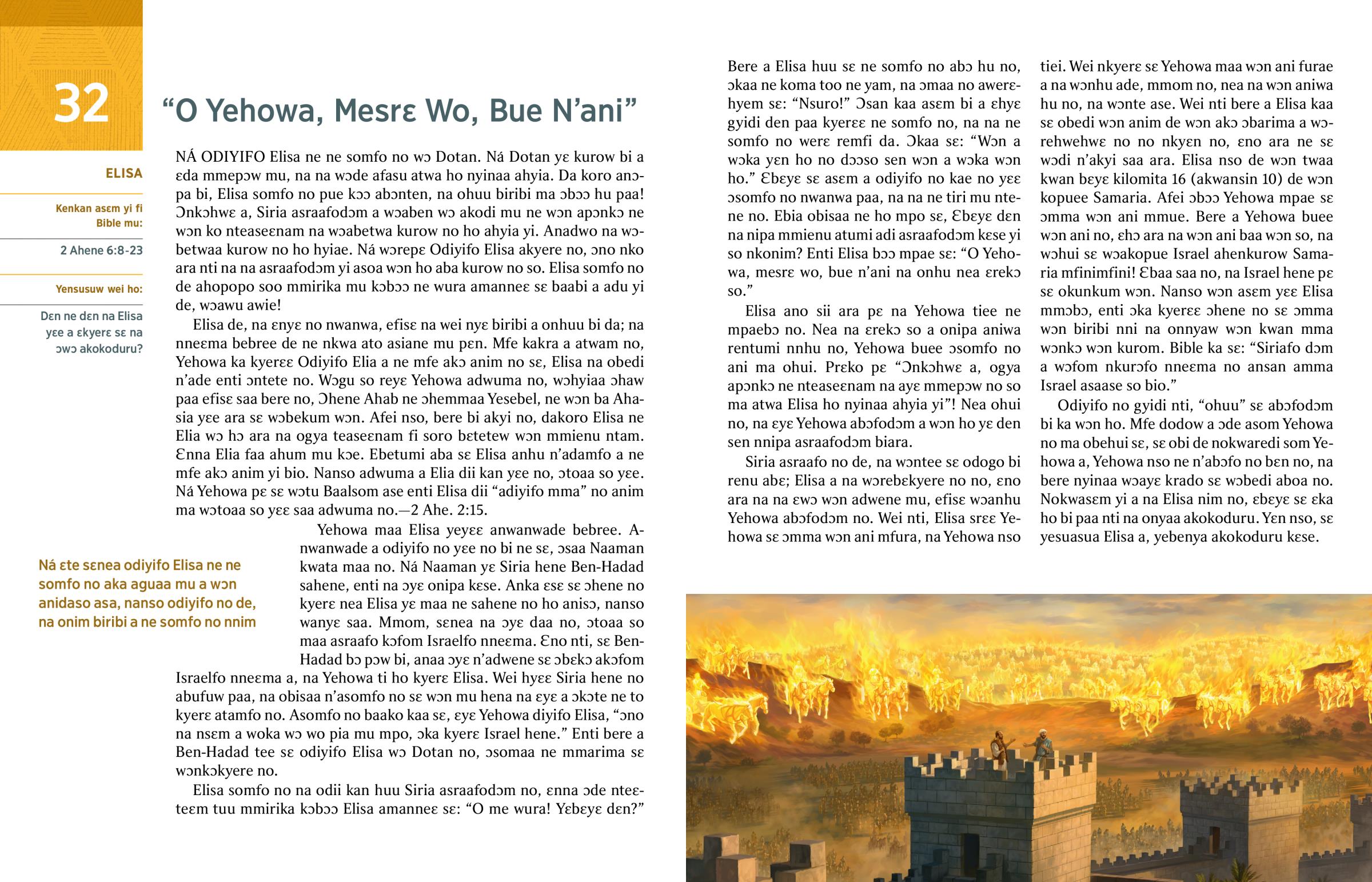 Elisa somfo no na odii kan huu Siria asraafodɔm no, ɛnna ɔde nteɛteɛm tuu mmirika kɔbɔɔ Elisa amanneɛ sɛ: “O me wura! Yɛbɛyɛ dɛn?” Bere a Elisa huu sɛ ne somfo no abɔ hu no, ɔkaa ne koma too ne yam, na ɔmaa no awerɛhyem sɛ: “Nsuro!” Ɔsan kaa asɛm bi a ɛhyɛ gyidi den paa kyerɛɛ ne somfo no, na na ne somfo no werɛ remfi da. Ɔkaa sɛ: “Wɔn a wɔka yɛn ho no dɔɔso sen wɔn a wɔka wɔn ho.” Ɛbɛyɛ sɛ asɛm a odiyifo no kae no yɛɛ ɔsomfo no nwanwa paa, na na ne tiri mu ntene no. Ebia obisaa ne ho mpo sɛ, Ɛbɛyɛ dɛn na nipa mmienu atumi adi asraafodɔm kɛse yi so nkonim? Enti Elisa bɔɔ mpae sɛ: “O Yehowa, mesrɛ wo, bue n’ani na onhu nea ɛrekɔ so.”