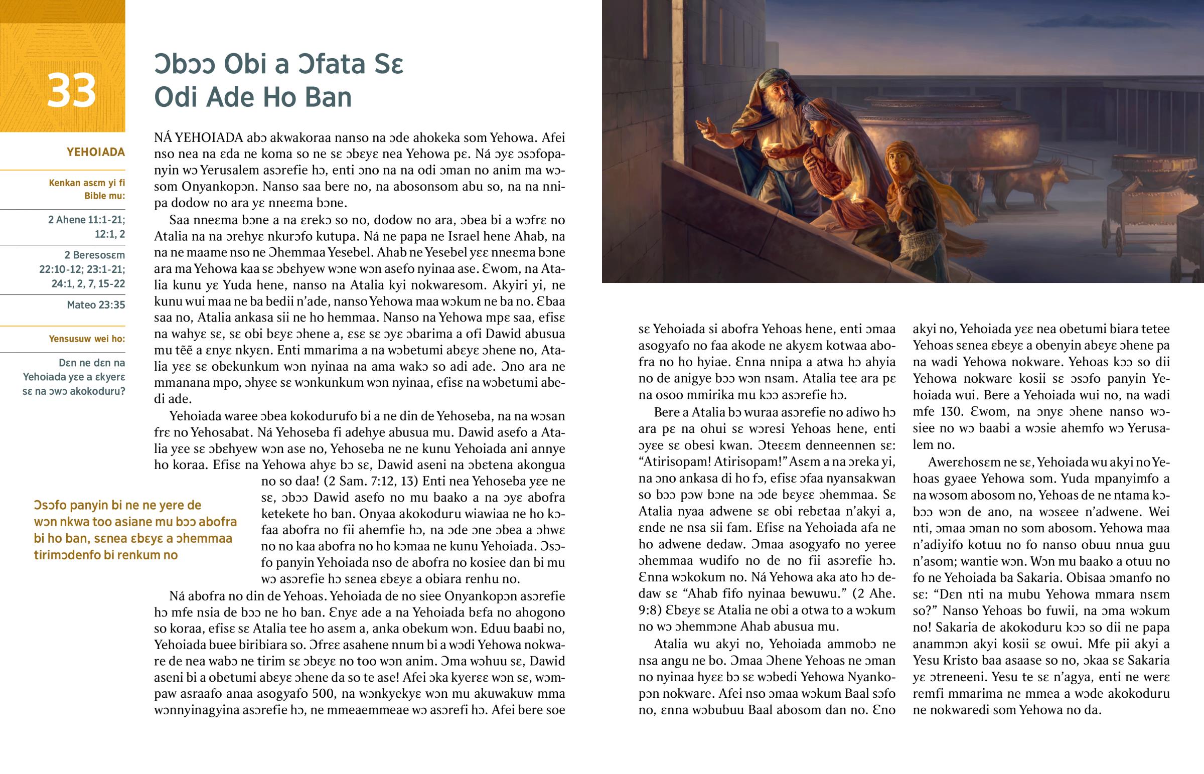 Awerɛhosɛm ne sɛ, Yehoiada wu akyi no Yehoas gyaee Yehowa som. Yuda mpanyimfo a na wɔsom abosom no, Yehoas de ne ntama kɔbɔɔ wɔn de ano, na wɔsɛee n’adwene. Wei nti, ɔmaa ɔman no som abosom. Yehowa maa n’adiyifo kotuu no fo nanso obuu nnua guu n’asom; wantie wɔn. Wɔn mu baako a otuu no fo ne Yehoiada ba Sakaria. Obisaa ɔmanfo no sɛ: “Dɛn nti na mubu Yehowa mmara nsɛm so?” Nanso Yehoas bo fuwii, na ɔma wɔkum no! Sakaria de akokoduru kɔɔ so dii ne papa anammɔn akyi kosii sɛ owui. Mfe pii akyi a Yesu Kristo baa asaase so no, ɔkaa sɛ Sakaria yɛ ɔtreneeni. Yesu te sɛ n’agya, enti ne werɛ remfi mmarima ne mmea a wɔde akokoduru ne nokwaredi som Yehowa no da.