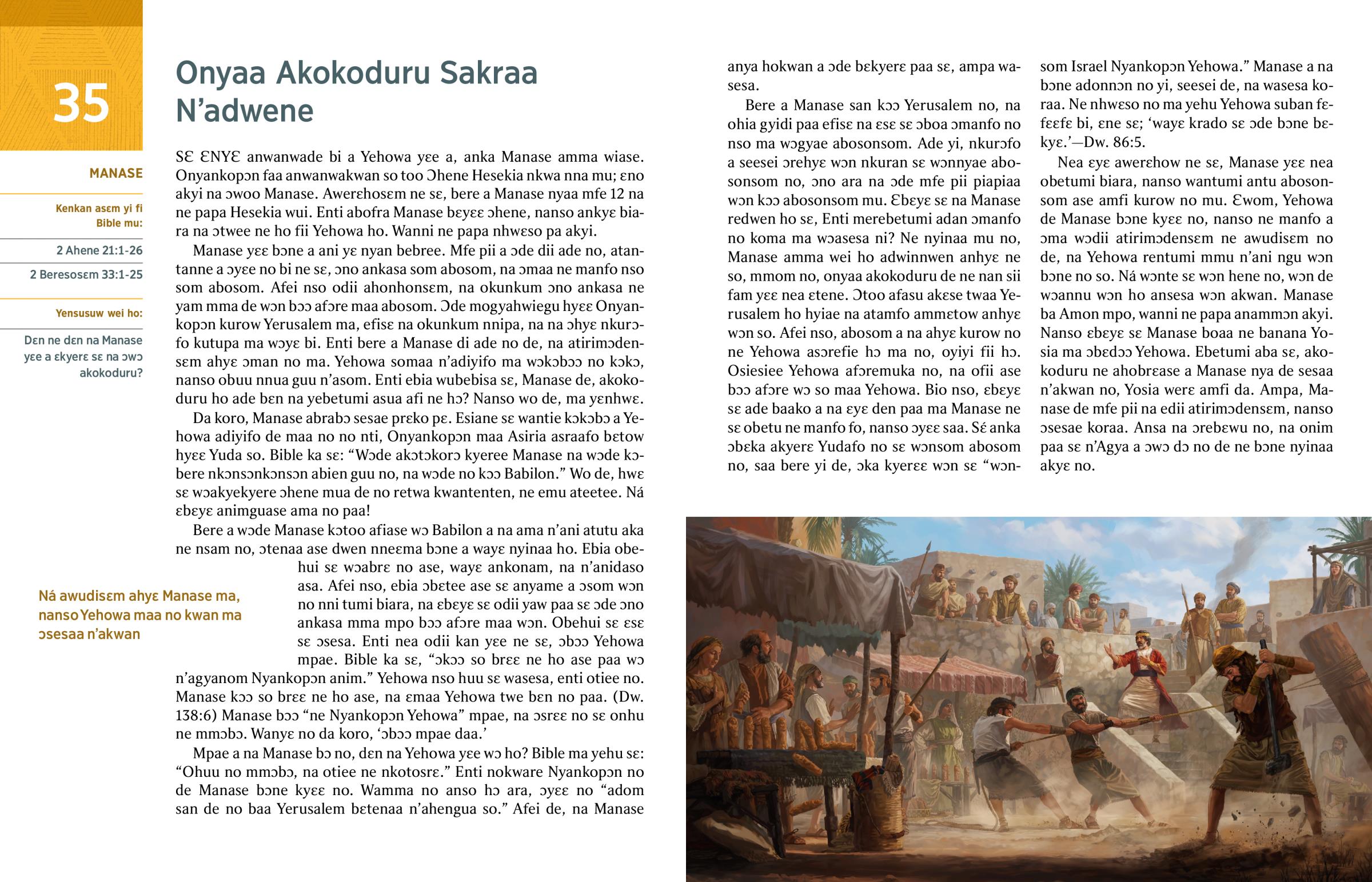 Manase yɛɛ bɔne a ani yɛ nyan bebree. Mfe pii a ɔde dii ade no, atantanne a ɔyɛe no bi ne sɛ, ɔno ankasa som abosom, na ɔmaa ne manfo nso som abosom. Afei nso odii ahonhonsɛm, na okunkum ɔno ankasa ne yam mma de wɔn bɔɔ afɔre maa abosom. Ɔde mogyahwiegu hyɛɛ Onyankopɔn kurow Yerusalem ma, efisɛ na okunkum nnipa, na na ɔhyɛ nkurɔfo kutupa ma wɔyɛ bi. Enti bere a Manase di ade no de, na atirimɔdensɛm ahyɛ ɔman no ma. Yehowa somaa n’adiyifo ma wɔkɔbɔɔ no kɔkɔ, nanso obuu nnua guu n’asom. Enti ebia wubebisa sɛ, Manase de, akokoduru ho ade bɛn na yebetumi asua afi ne hɔ? Nanso wo de, ma yɛnhwɛ.