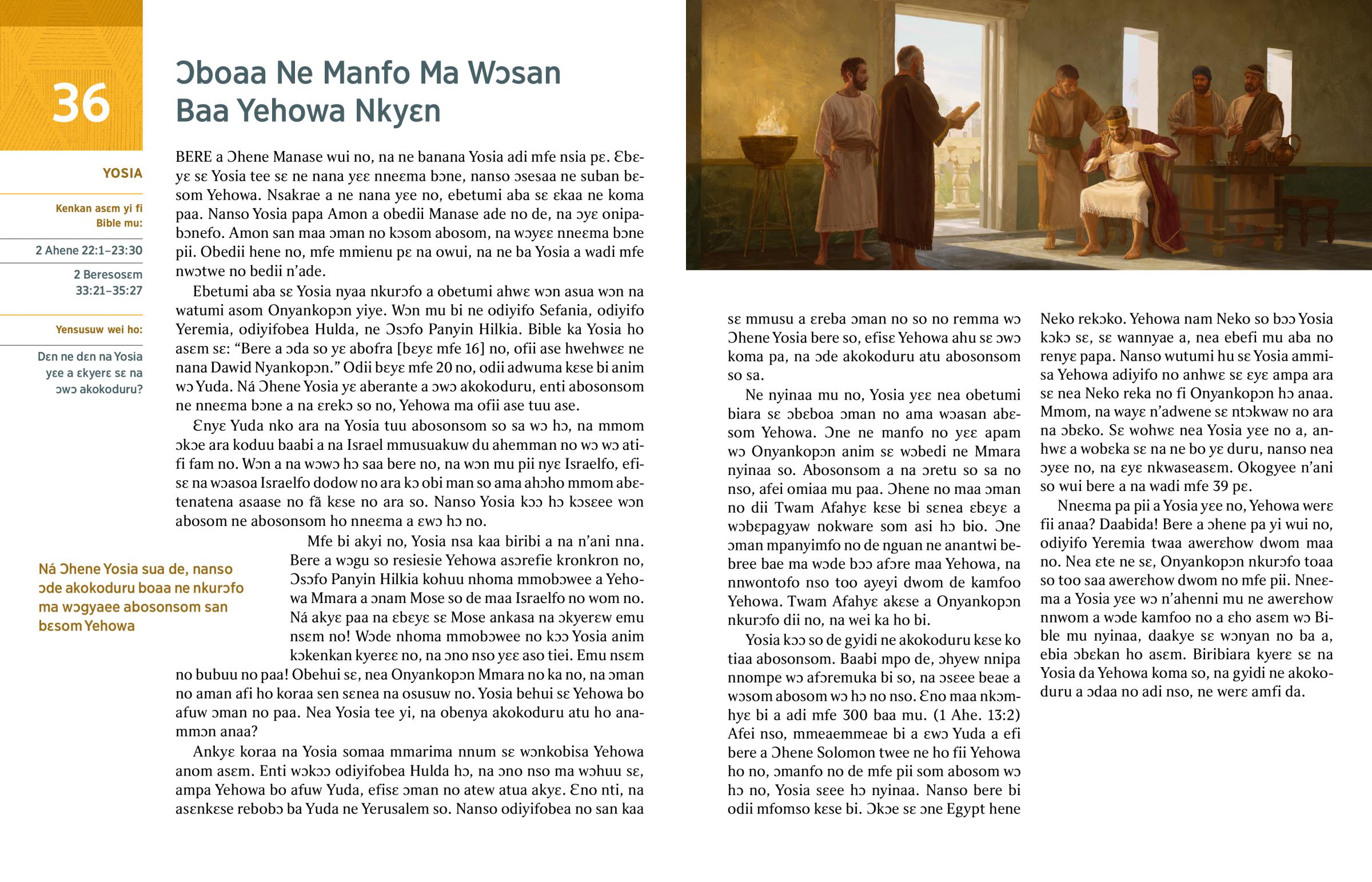 Ne nyinaa mu no, Yosia yɛɛ nea obetumi biara sɛ ɔbɛboa ɔman no ama wɔasan abɛsom Yehowa. Ɔne ne manfo no yɛɛ apam wɔ Onyankopɔn anim sɛ wɔbedi ne Mmara nyinaa so. Abosonsom a na ɔretu so sa no nso, afei omiaa mu paa. Ɔhene no maa ɔman no dii Twam Afahyɛ kɛse bi sɛnea ɛbɛyɛ a wɔbɛpagyaw nokware som asi hɔ bio. Ɔne ɔman mpanyimfo no de nguan ne anantwi bebree bae ma wɔde bɔɔ afɔre maa Yehowa, na nnwontofo nso too ayeyi dwom de kamfoo Yehowa. Twam Afahyɛ akɛse a Onyankopɔn nkurɔfo dii no, na wei ka ho bi.