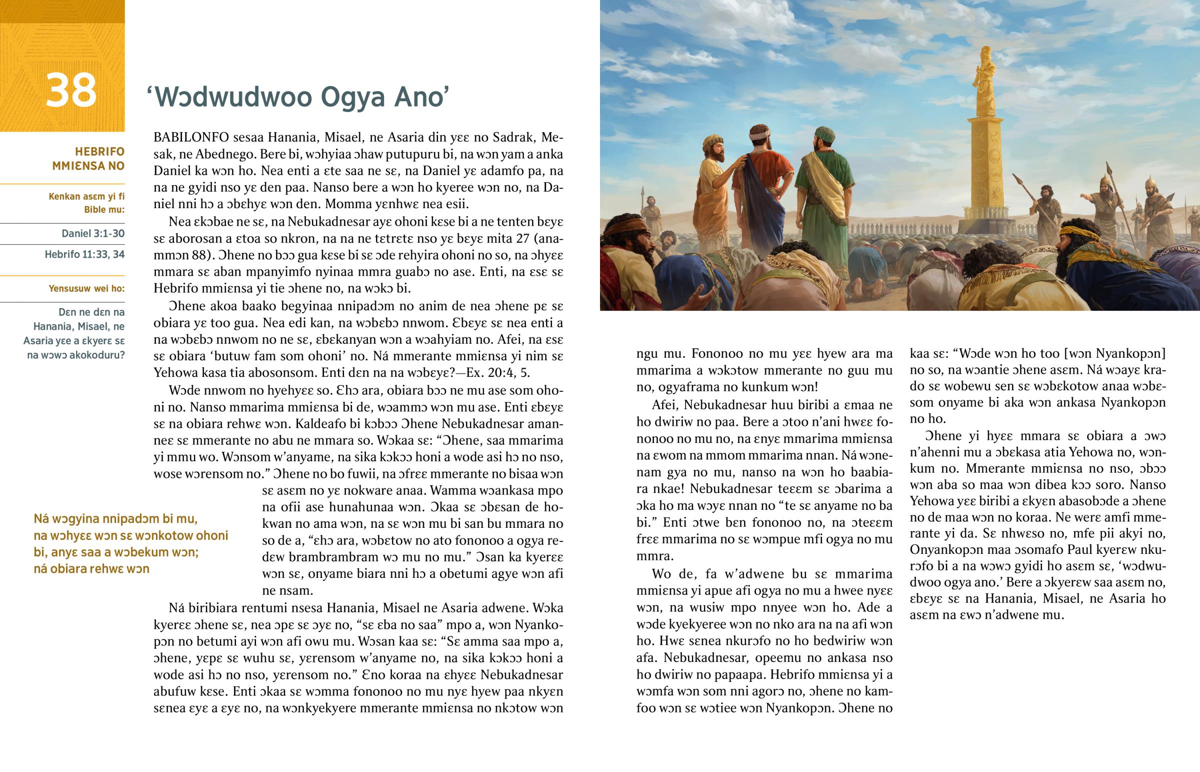 Wo de, fa w’adwene bu sɛ mmarima mmiɛnsa yi apue afi ogya no mu a hwee nyɛɛ wɔn, na wusiw mpo nnyee wɔn ho. Ade a wɔde kyekyeree wɔn no nko ara na na afi wɔn ho. Hwɛ sɛnea nkurɔfo no ho bedwiriw wɔn afa. Nebukadnesar, opeemu no ankasa nso ho dwiriw no papaapa. Hebrifo mmiɛnsa yi a wɔmfa wɔn som nni agorɔ no, ɔhene no kamfoo wɔn sɛ wɔtiee wɔn Nyankopɔn. Ɔhene no kaa sɛ: “Wɔde wɔn ho too [wɔn Nyankopɔn] no so, na wɔantie ɔhene asɛm. Ná wɔayɛ krado sɛ wobewu sen sɛ wɔbɛkotow anaa wɔbɛsom onyame bi aka wɔn ankasa Nyankopɔn no ho.