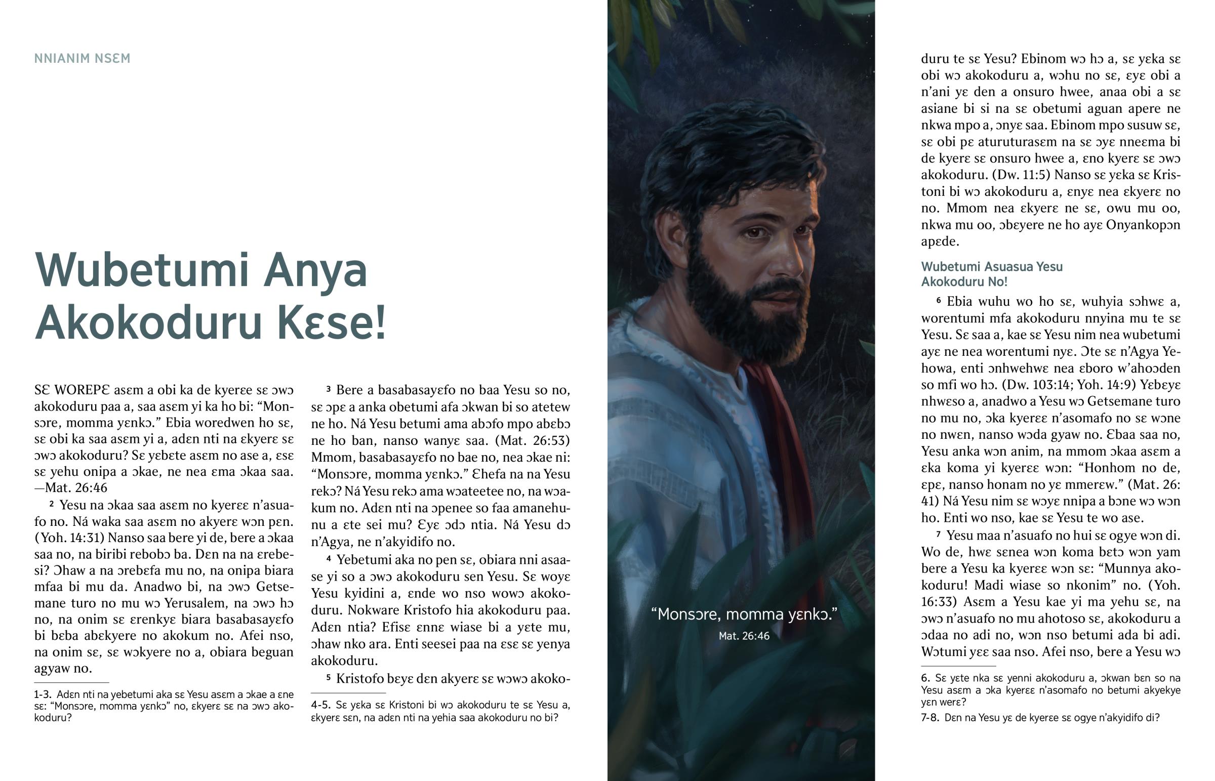 2 Yesu na ɔkaa saa asɛm no kyerɛɛ n’asuafo no. Ná waka saa asɛm no akyerɛ wɔn pɛn. (Yoh. 14:31) Nanso saa bere yi de, bere a ɔkaa saa no, na biribi rebobɔ ba. Dɛn na na ɛrebesi? Ɔhaw a na ɔrebɛfa mu no, na onipa biara mfaa bi mu da. Anadwo bi, na ɔwɔ Getsemane turo no mu wɔ Yerusalem, na ɔwɔ hɔ no, na onim sɛ ɛrenkyɛ biara basabasayɛfo bi bɛba abɛkyere no akokum no. Afei nso, na onim sɛ, sɛ wɔkyere no a, obiara beguan agyaw no.