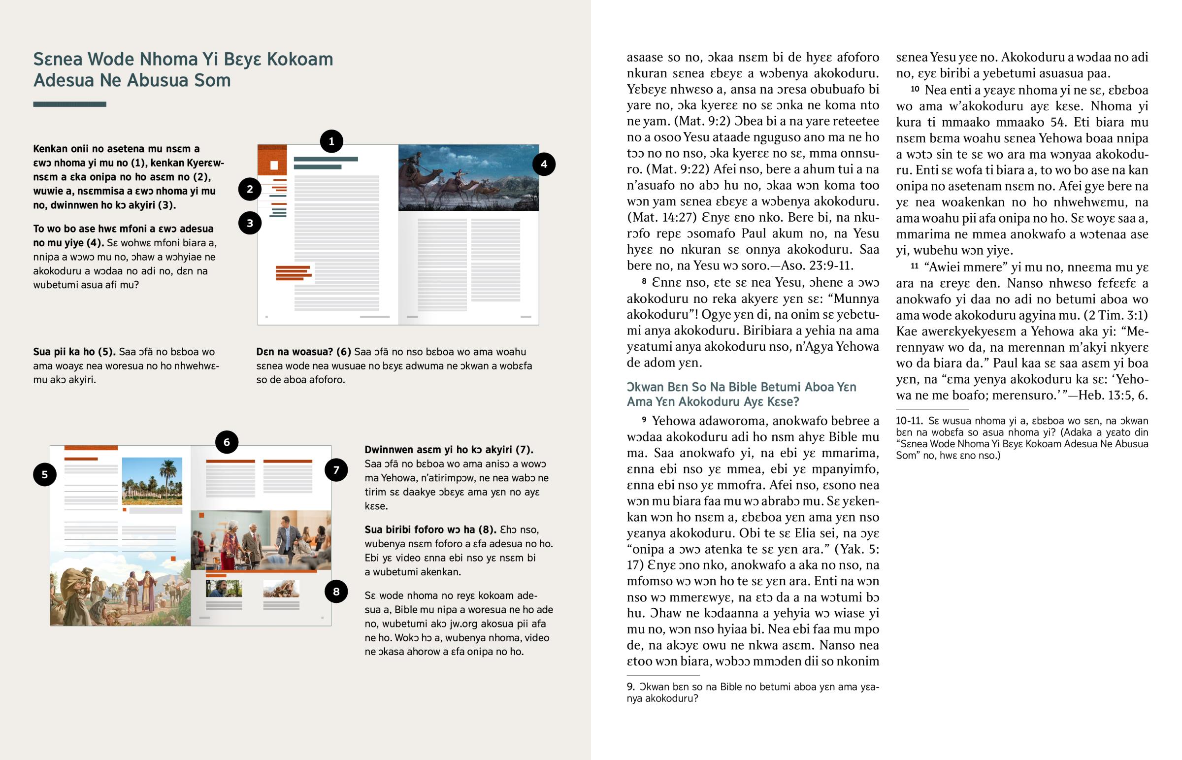 10 Nea enti a yɛayɛ nhoma yi ne sɛ, ɛbɛboa wo ama w’akokoduru ayɛ kɛse. Nhoma yi kura ti mmaako mmaako 54. Eti biara mu nsɛm bɛma woahu sɛnea Yehowa boaa nnipa a wɔtɔ sin te sɛ wo ara ma wɔnyaa akokoduru. Enti sɛ wofa ti biara a, to wo bo ase na kan onipa no asetenam nsɛm no. Afei gye bere na yɛ nea woakenkan no ho nhwehwɛmu, na ama woahu pii afa onipa no ho. Sɛ woyɛ saa a, mmarima ne mmea anokwafo a wɔtenaa ase yi, wubehu wɔn yiye.