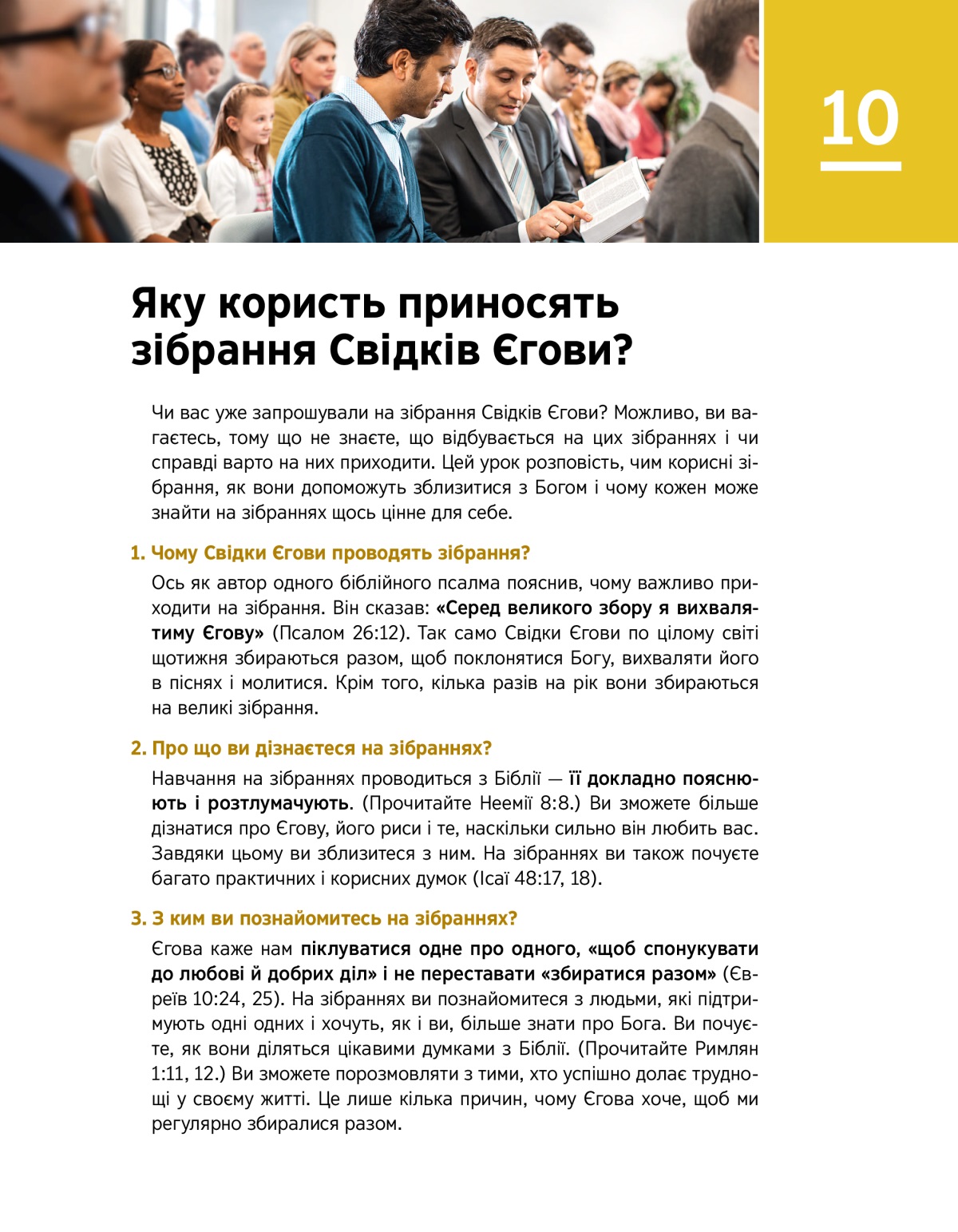 Чи вас уже запрошували на зібрання Свідків Єгови? Можливо, ви вагаєтесь, тому що не знаєте, що відбувається на цих зібраннях і чи справді варто на них приходити. Цей урок розповість, чим корисні зібрання, як вони допоможуть зблизитися з Богом і чому кожен може знайти на зібраннях щось цінне для себе.