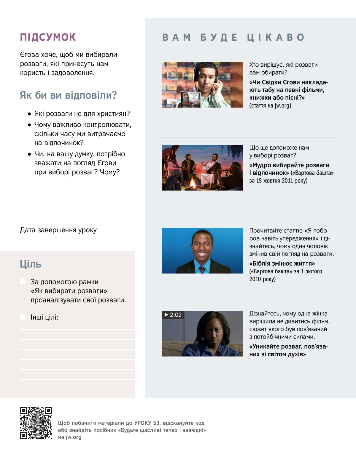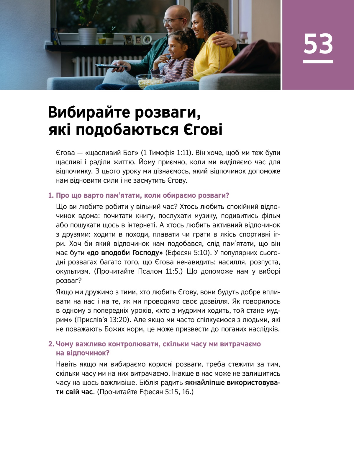 Що ви любите робити у вільний час? Хтось любить спокійний відпочинок вдома: почитати книгу, послухати музику, подивитись фільм або пошукати щось в інтернеті. А хтось любить активний відпочинок з друзями: ходити в походи, плавати чи грати в якісь спортивні ігри. Хоч би який відпочинок нам подобався, слід пам’ятати, що він має бути «до вподоби Господу» (Ефесян 5:10). У популярних сьогодні розвагах багато того, що Єгова ненавидить: насилля, розпуста, окультизм. (Прочитайте Псалом 11:5.) Що допоможе нам у виборі розваг?