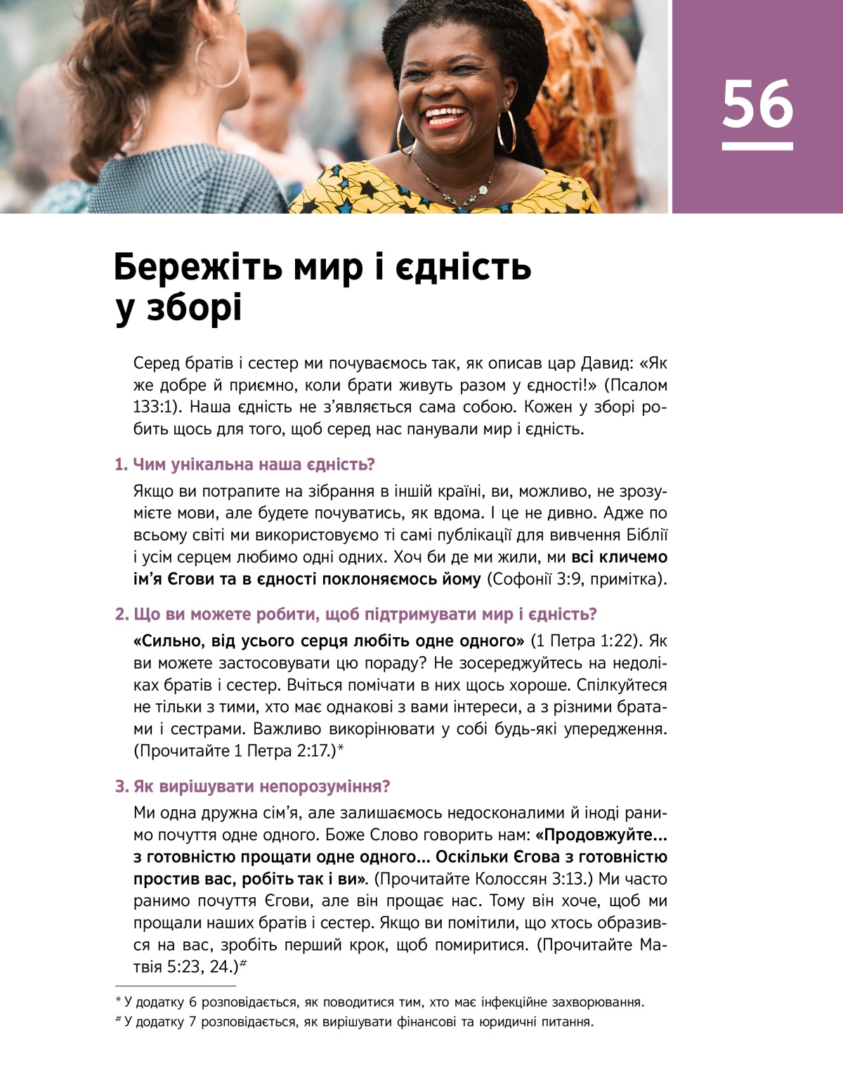 Якщо ви потрапите на зібрання в іншій країні, ви, можливо, не зрозумієте мови, але будете почуватись, як вдома. І це не дивно. Адже по всьому світі ми використовуємо ті самі публікації для вивчення Біблії і усім серцем любимо одні одних. Хоч би де ми жили, ми всі кличемо ім’я Єгови та в єдності поклоняємось йому (Софонії 3:9, примітка).