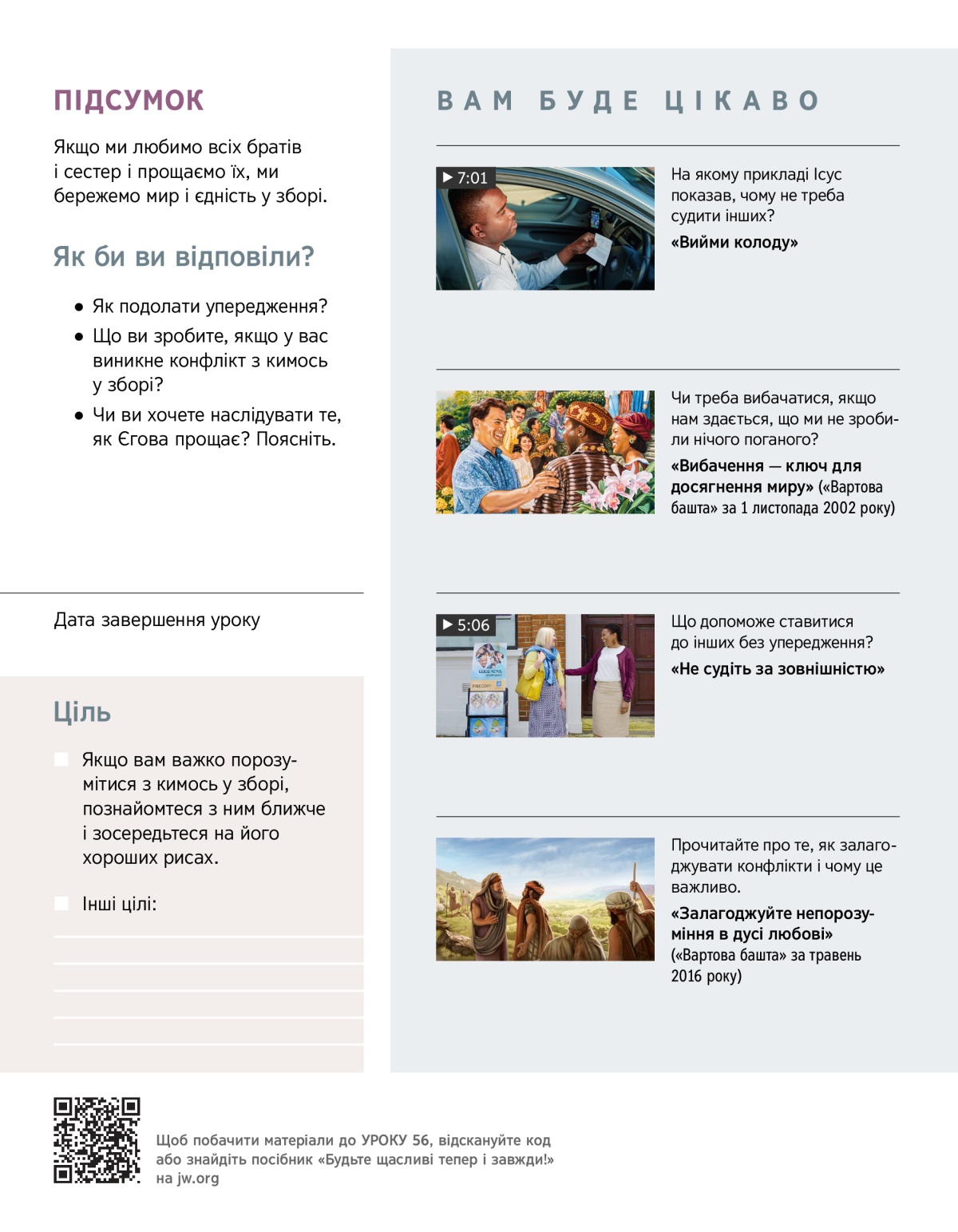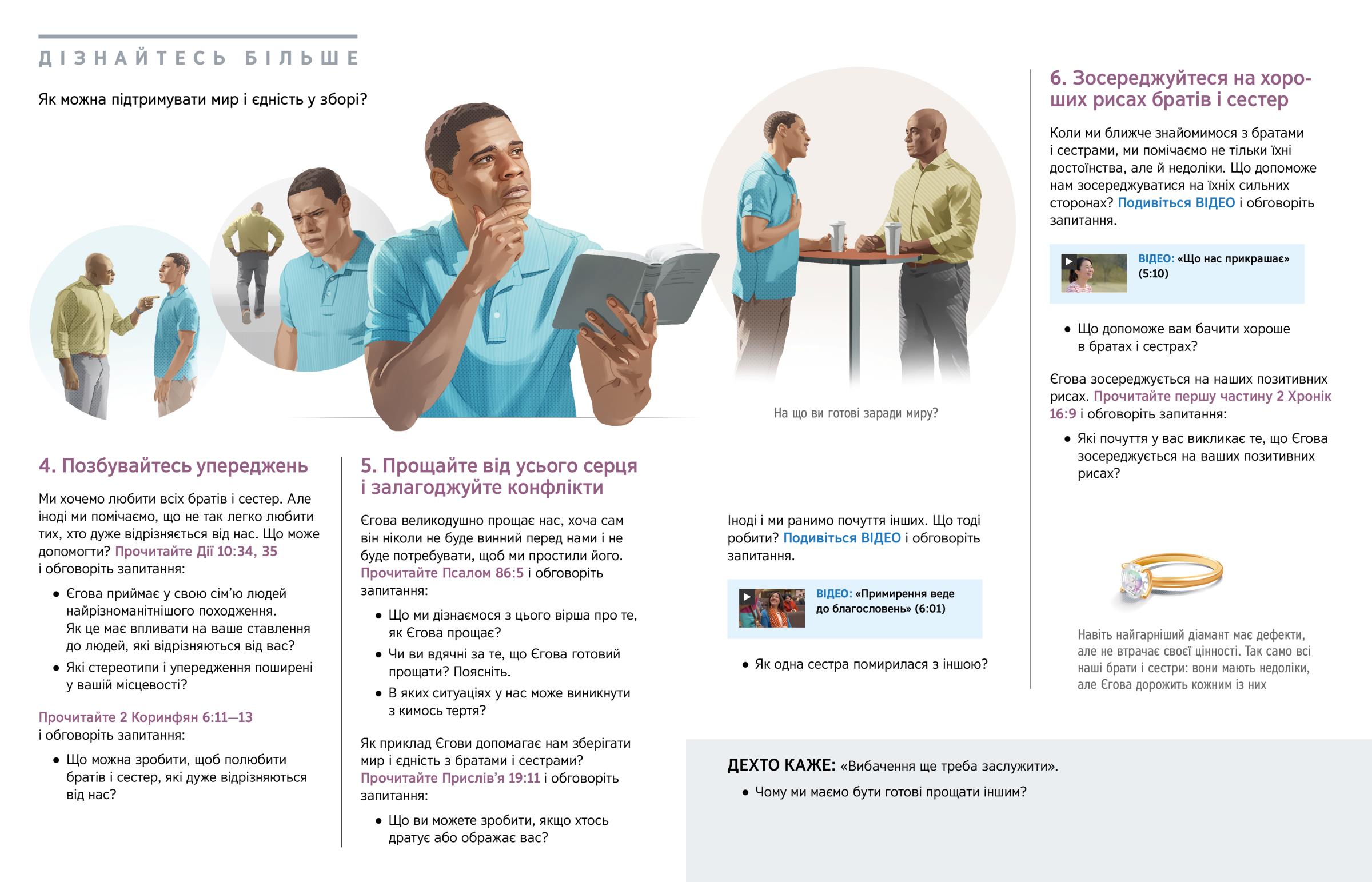 Коли ми ближче знайомимося з братами і сестрами, ми помічаємо не тільки їхні достоїнства, але й недоліки. Що допоможе нам зосереджуватися на їхніх сильних сторонах? Подивіться ВІДЕО і обговоріть запитання.