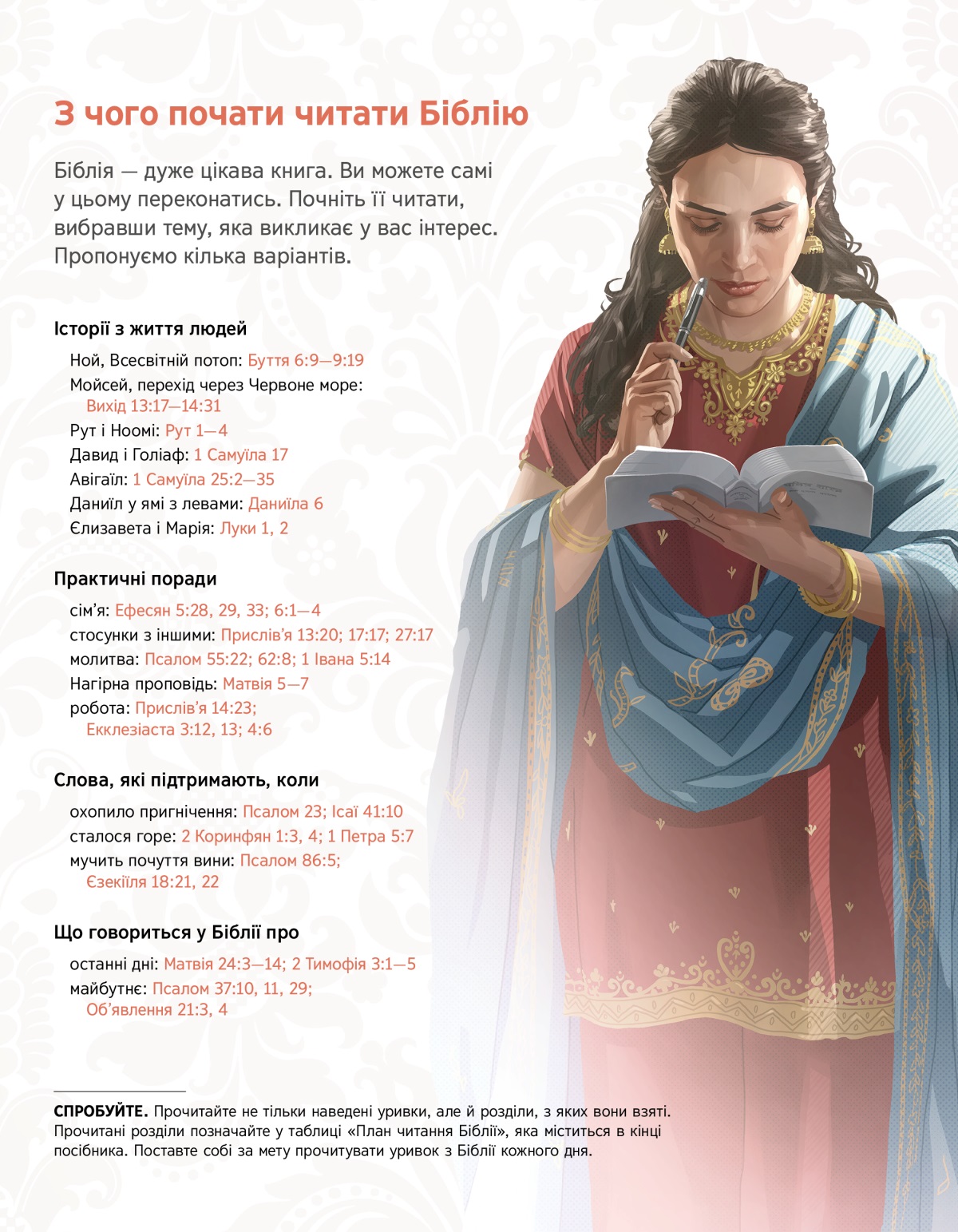 Біблія — дуже цікава книга. Ви можете самі у цьому переконатись. Почніть її читати, вибравши тему, яка викликає у вас інтерес. Пропонуємо кілька варіантів.