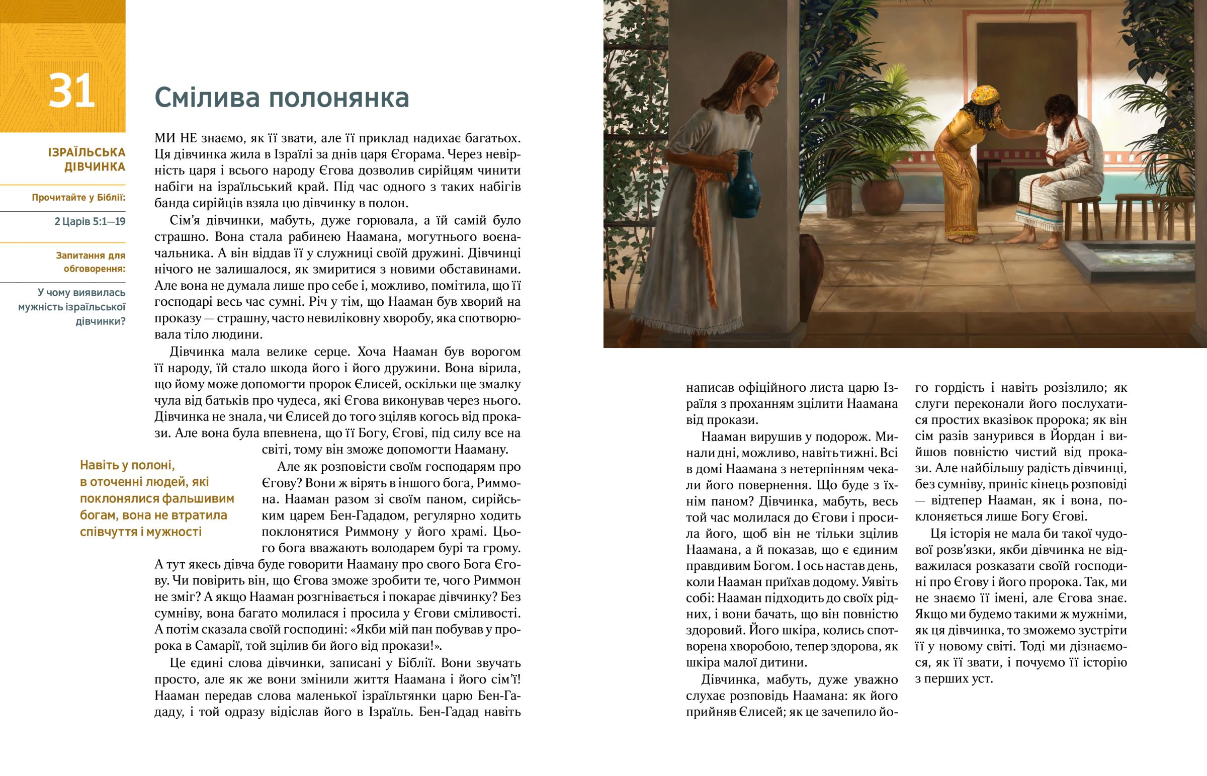 Дівчинка, мабуть, дуже уважно слухає розповідь Наамана: як його прийняв Єлисей; як це зачепило його гордість і навіть розізлило; як слуги переконали його послухатися простих вказівок пророка; як він сім разів занурився в Йордан і вийшов повністю чистий від прокази. Але найбільшу радість дівчинці, без сумніву, приніс кінець розповіді — відтепер Нааман, як і вона, поклоняється лише Богу Єгові.