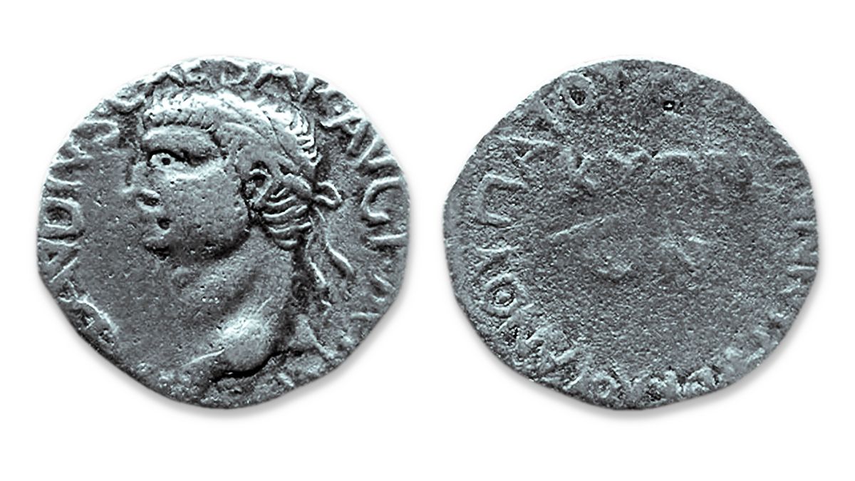Ілюстрація А. Монета, випущена за правління Клавдія. Він був імператором, коли Варнава і Павло відвідали Кіпр. У написі на монеті згадано, що Кіпром правив проконсул