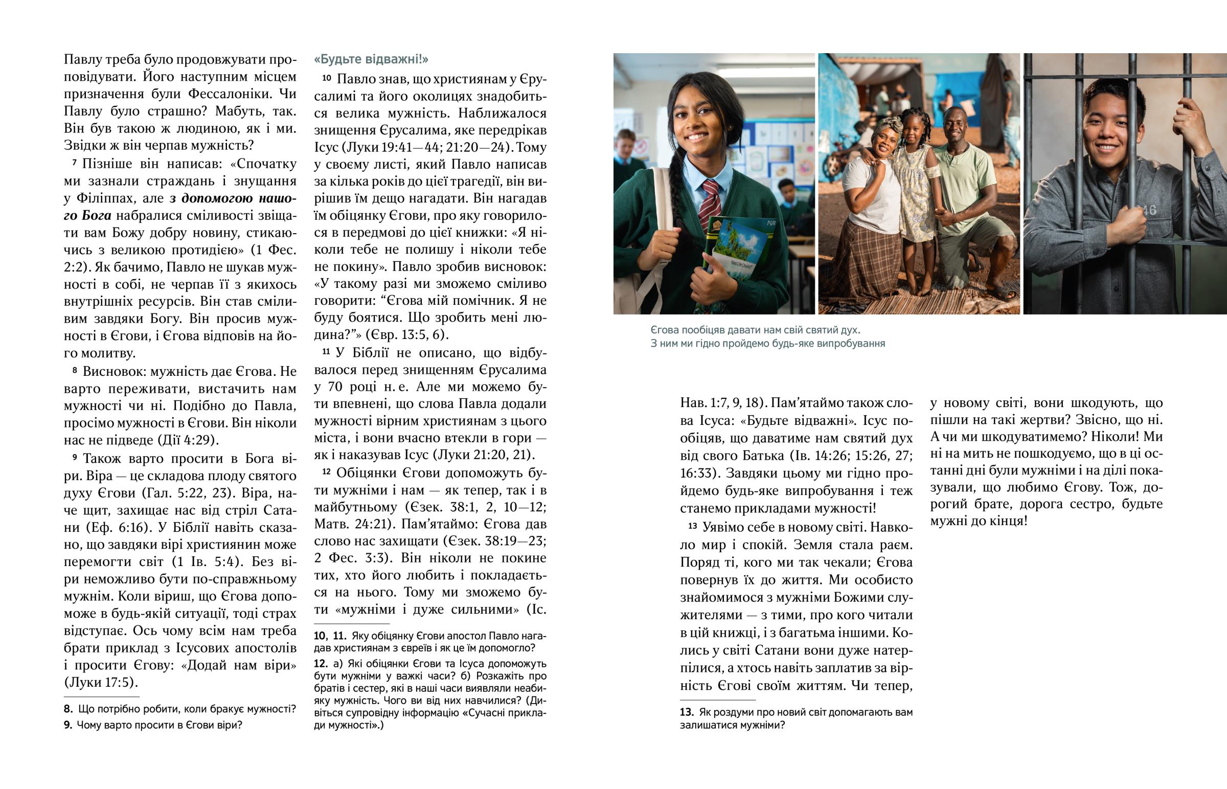 12. а) Які обіцянки Єгови та Ісуса допоможуть бути мужніми у важкі часи? б) Розкажіть про братів і сестер, які в наші часи виявляли неабияку мужність. Чого ви від них навчилися? (Дивіться супровідну інформацію «Сучасні приклади мужності».)