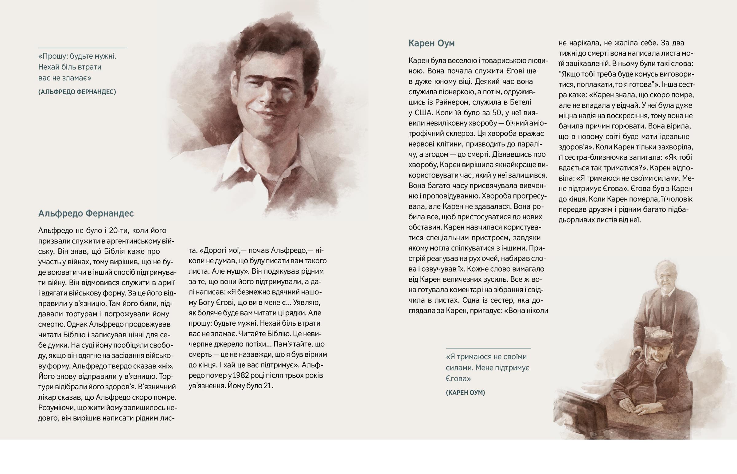 13 Уявімо себе в новому світі. Навколо мир і спокій. Земля стала раєм. Поряд ті, кого ми так чекали; Єгова повернув їх до життя. Ми особисто знайомимося з мужніми Божими служителями — з тими, про кого читали в цій книжці, і з багатьма іншими. Колись у світі Сатани вони дуже натерпілися, а хтось навіть заплатив за вірність Єгові своїм життям. Чи тепер, у новому світі, вони шкодують, що пішли на такі жертви? Звісно, що ні. А чи ми шкодуватимемо? Ніколи! Ми ні на мить не пошкодуємо, що в ці останні дні були мужніми і на ділі показували, що любимо Єгову. Тож, дорогий брате, дорога сестро, будьте мужні до кінця!