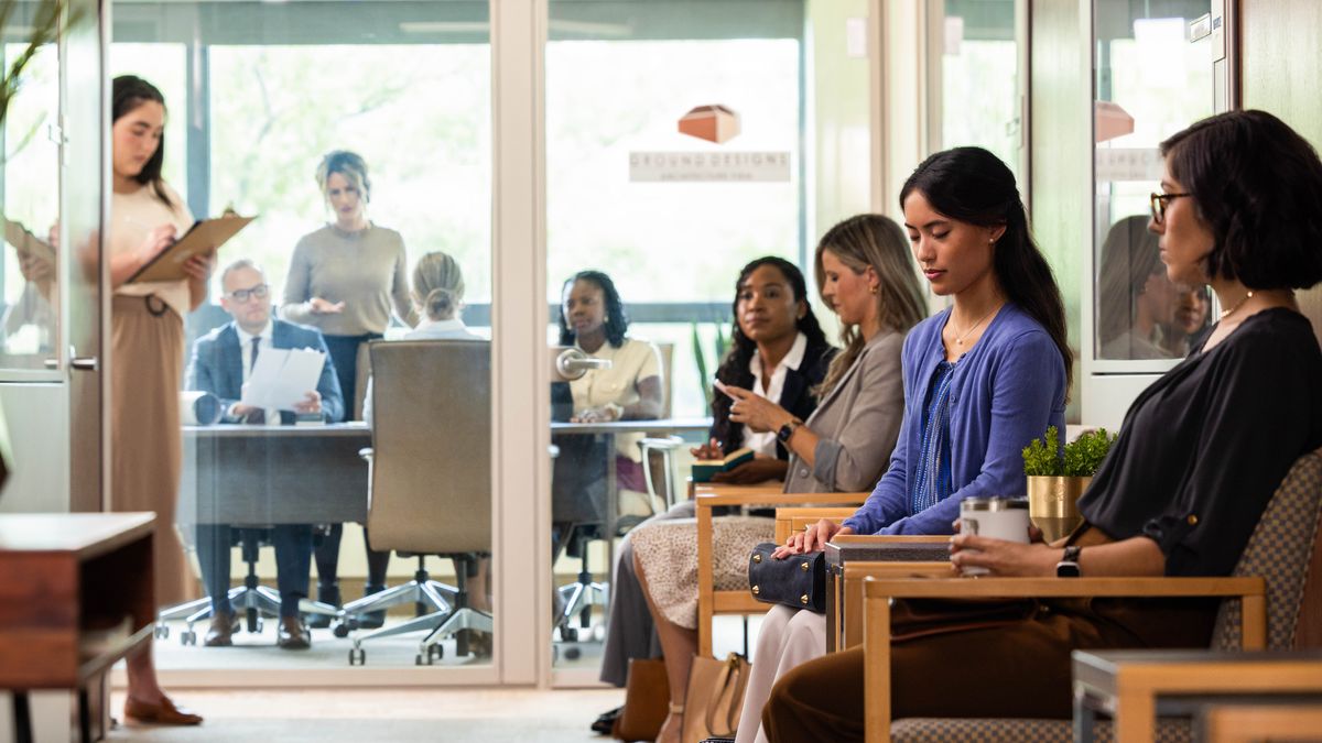 c ОПИС ІЛЮСТРАЦІЇ: сестра прийшла влаштовуватися на роботу. Перед співбесідою вона подумки молиться до Єгови.