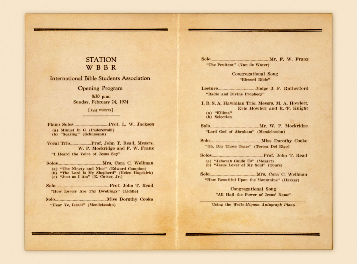 У неділю ввечері, 24 лютого 1924 року, Дослідники Бібліїa вперше вийшли у прямий ефір зі своєї нової радіостанції WBBR. Як відбувалася трансляція? Хто її почув? І як сьогодні Свідки Єгови використовують новітні технології, щоб поширювати «добру новину про Царство... по цілій населеній землі»? (Матвія 24:14).