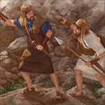 Через деякий час ізраїльтяни почали воювати з філісти́млянами. У філісти́мському війську був воїн-велетень, на ім’я Голіаф. Кожного дня Голіаф виходив до ізраїльтян і насміхався над ними. Він кричав: «Виберіть чоловіка, який буде битися зі мною. Якщо він переможе, то ми станемо вашими слугами. Але якщо переможу я, то ви станете нашими слугами».