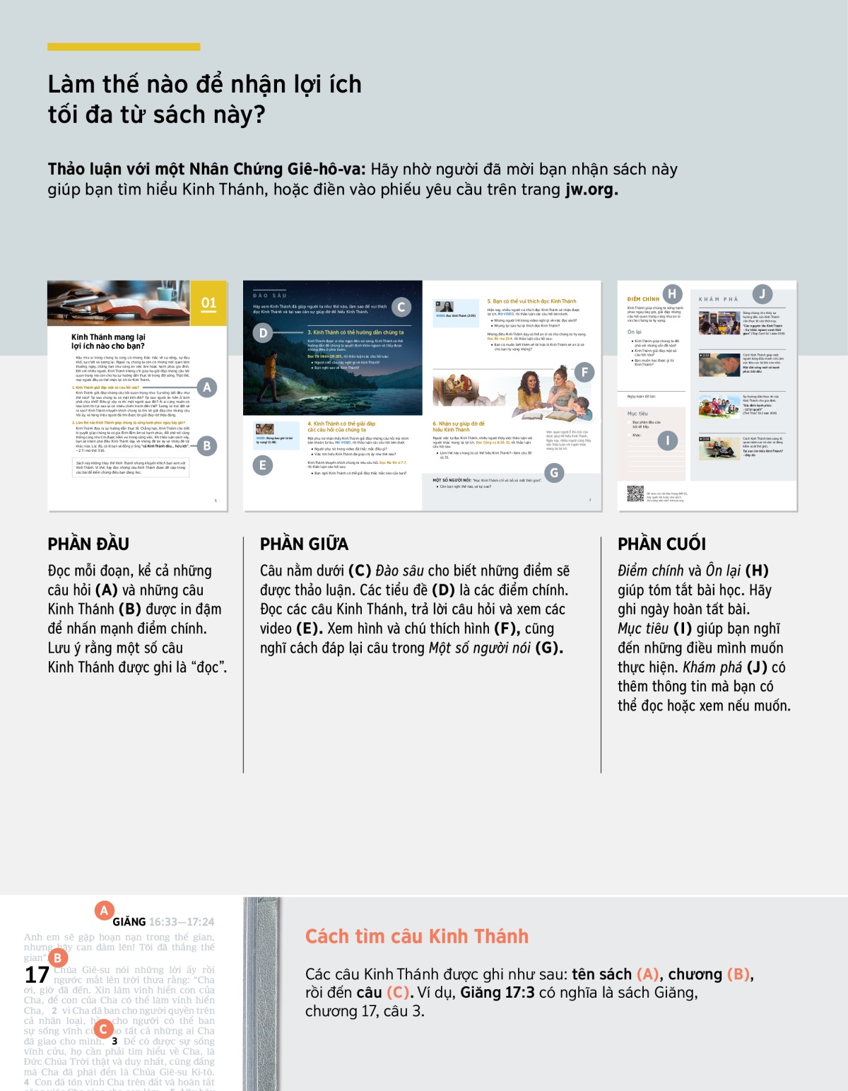 Các câu Kinh Thánh được ghi như sau: tên sách (A), chương (B), rồi đến câu (C). Ví dụ, Giăng 17:3 có nghĩa là sách Giăng, chương 17, câu 3.