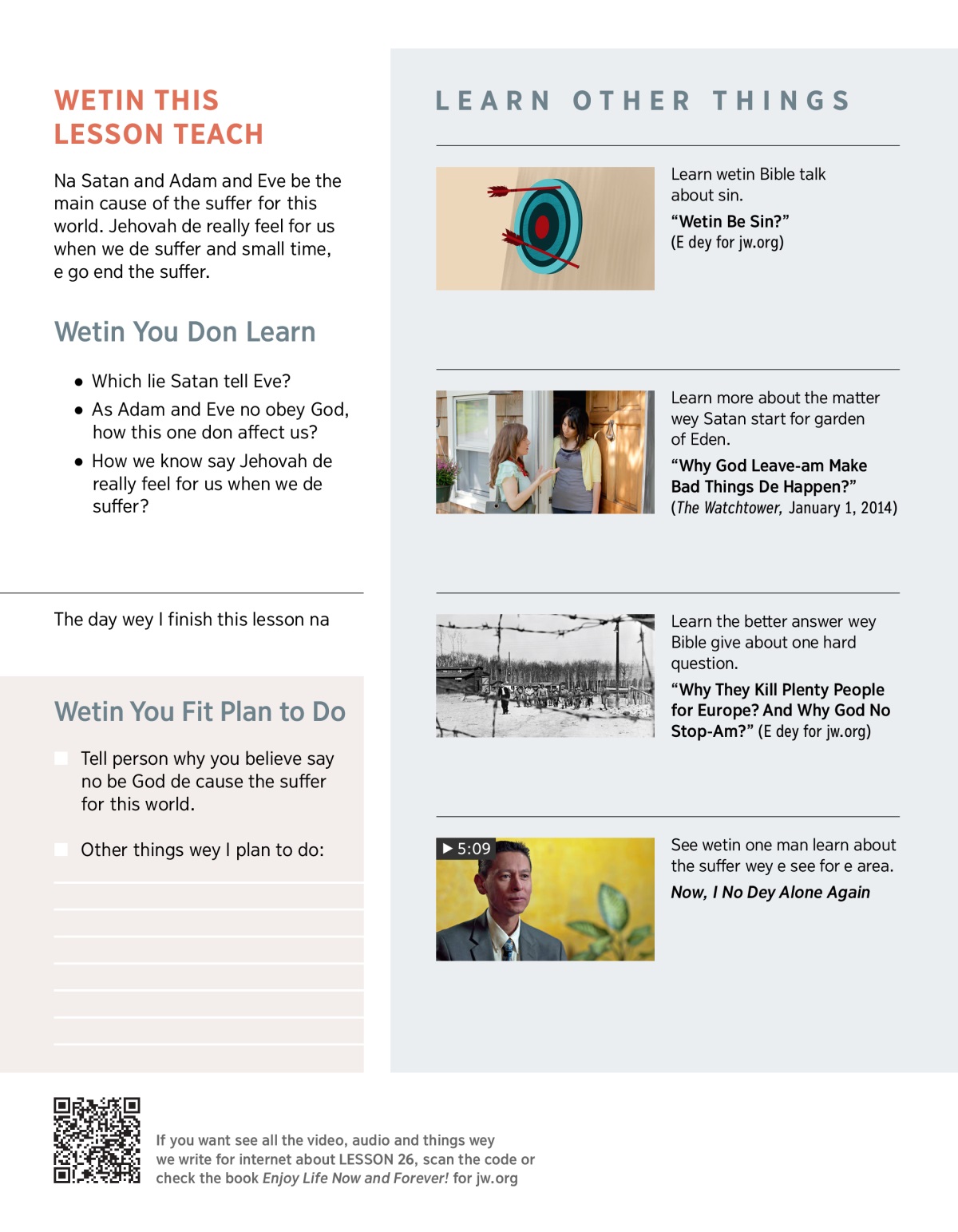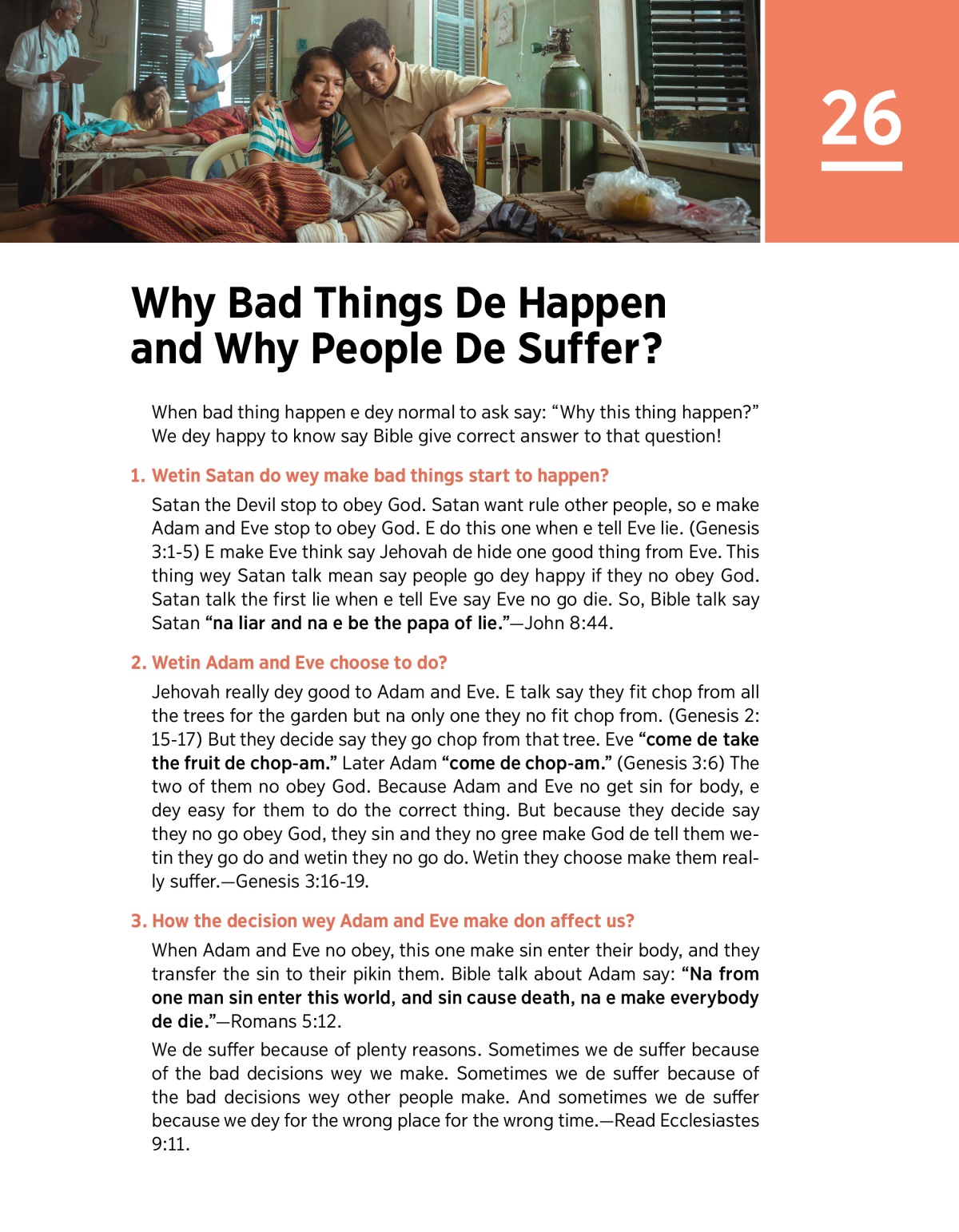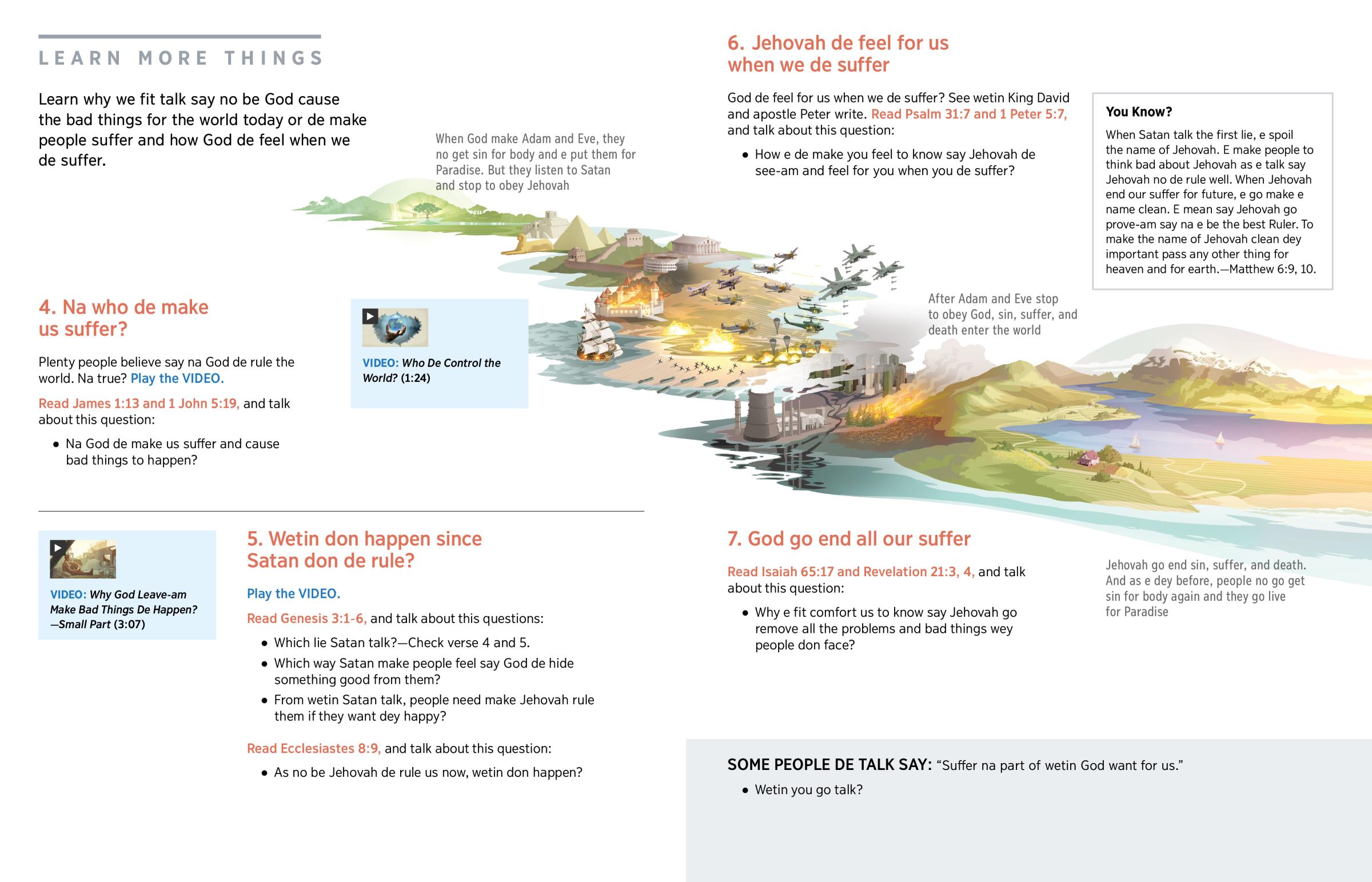 Na Satan and Adam and Eve be the main cause of the suffer for this world. Jehovah de really feel for us when we de suffer and small time, e go end the suffer.