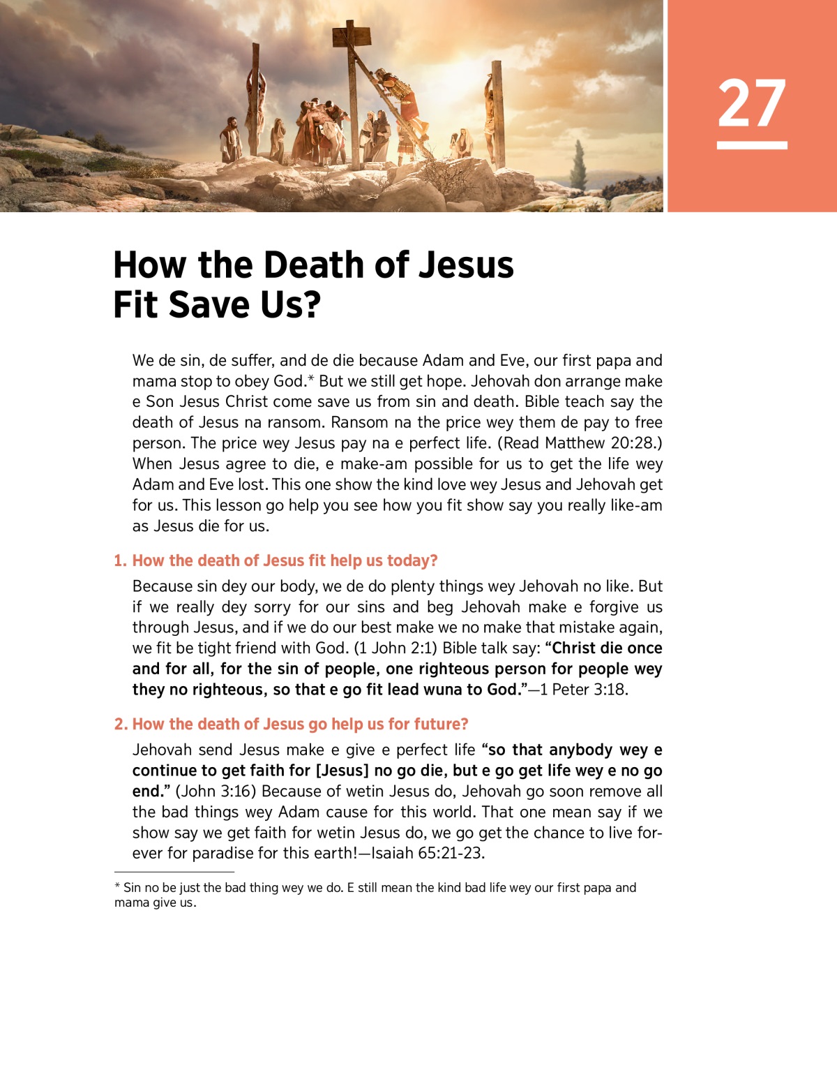 We de sin, de suffer, and de die because Adam and Eve, our first papa and mama stop to obey God.a But we still get hope. Jehovah don arrange make e Son Jesus Christ come save us from sin and death. Bible teach say the death of Jesus na ransom. Ransom na the price wey them de pay to free person. The price wey Jesus pay na e perfect life. (Read Matthew 20:28.) When Jesus agree to die, e make-am possible for us to get the life wey Adam and Eve lost. This one show the kind love wey Jesus and Jehovah get for us. This lesson go help you see how you fit show say you really like-am as Jesus die for us.