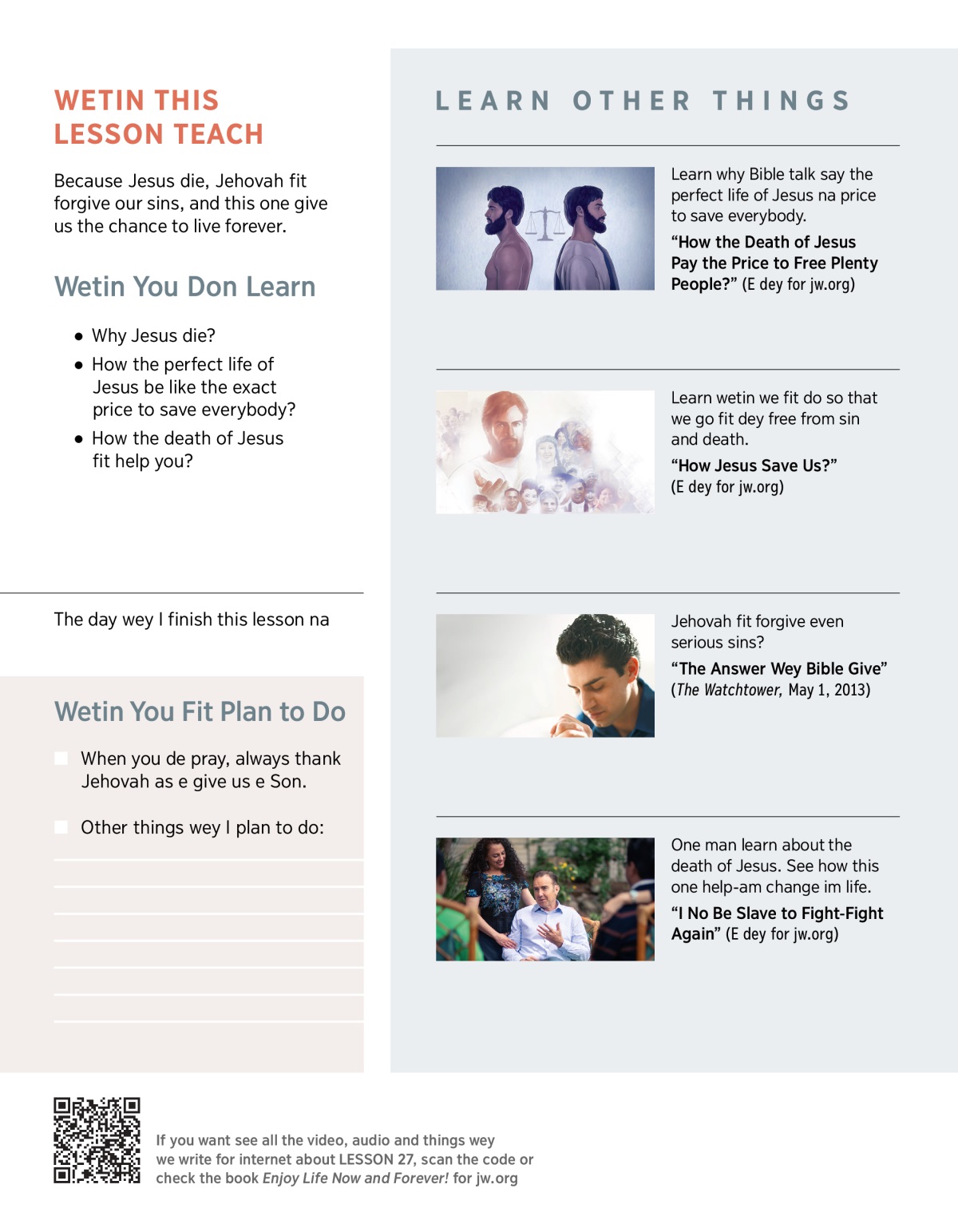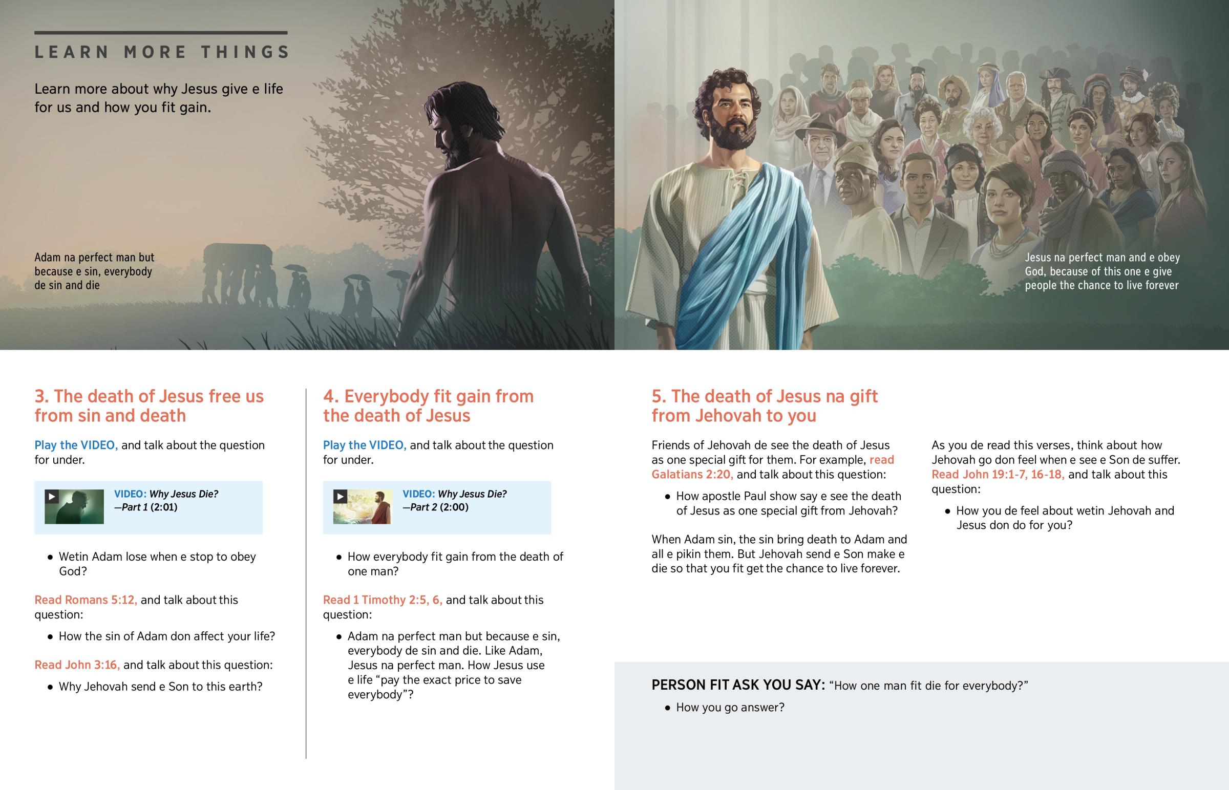 When Adam sin, the sin bring death to Adam and all e pikin them. But Jehovah send e Son make e die so that you fit get the chance to live forever.