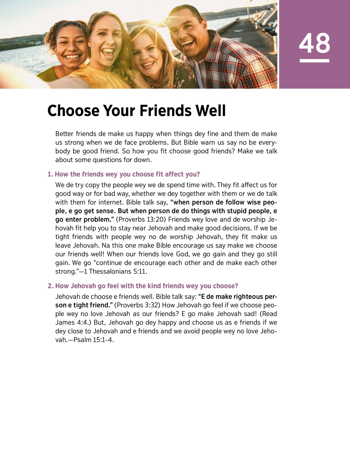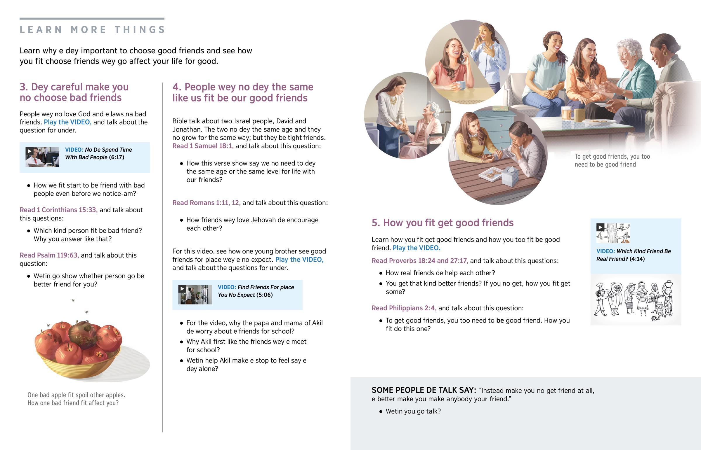 Better friends de make us happy when things dey fine and them de make us strong when we de face problems. But Bible warn us say no be everybody be good friend. So how you fit choose good friends? Make we talk about some questions for down.