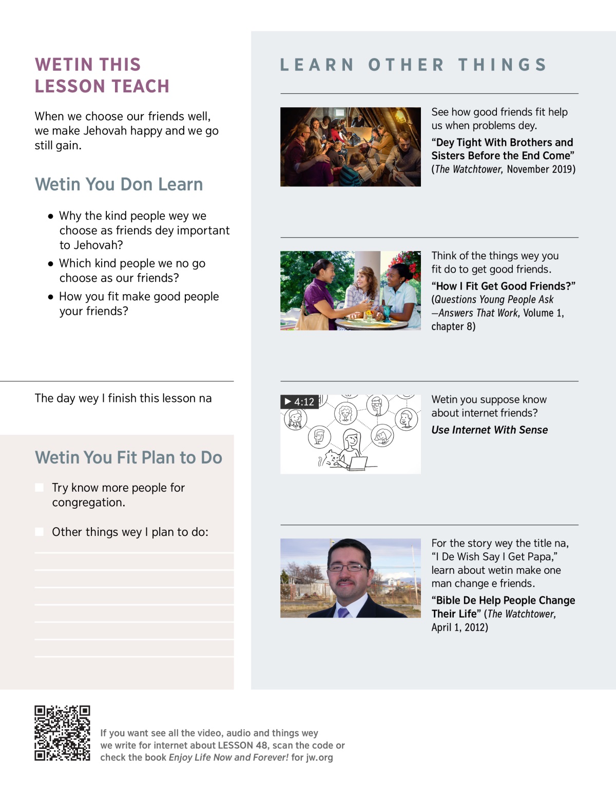 We de try copy the people wey we de spend time with. They fit affect us for good way or for bad way, whether we dey together with them or we de talk with them for internet. Bible talk say, “when person de follow wise people, e go get sense. But when person de do things with stupid people, e go enter problem.” (Proverbs 13:20) Friends wey love and de worship Jehovah fit help you to stay near Jehovah and make good decisions. If we be tight friends with people wey no de worship Jehovah, they fit make us leave Jehovah. Na this one make Bible encourage us say make we choose our friends well! When our friends love God, we go gain and they go still gain. We go “continue de encourage each other and de make each other strong.”—1 Thessalonians 5:11.