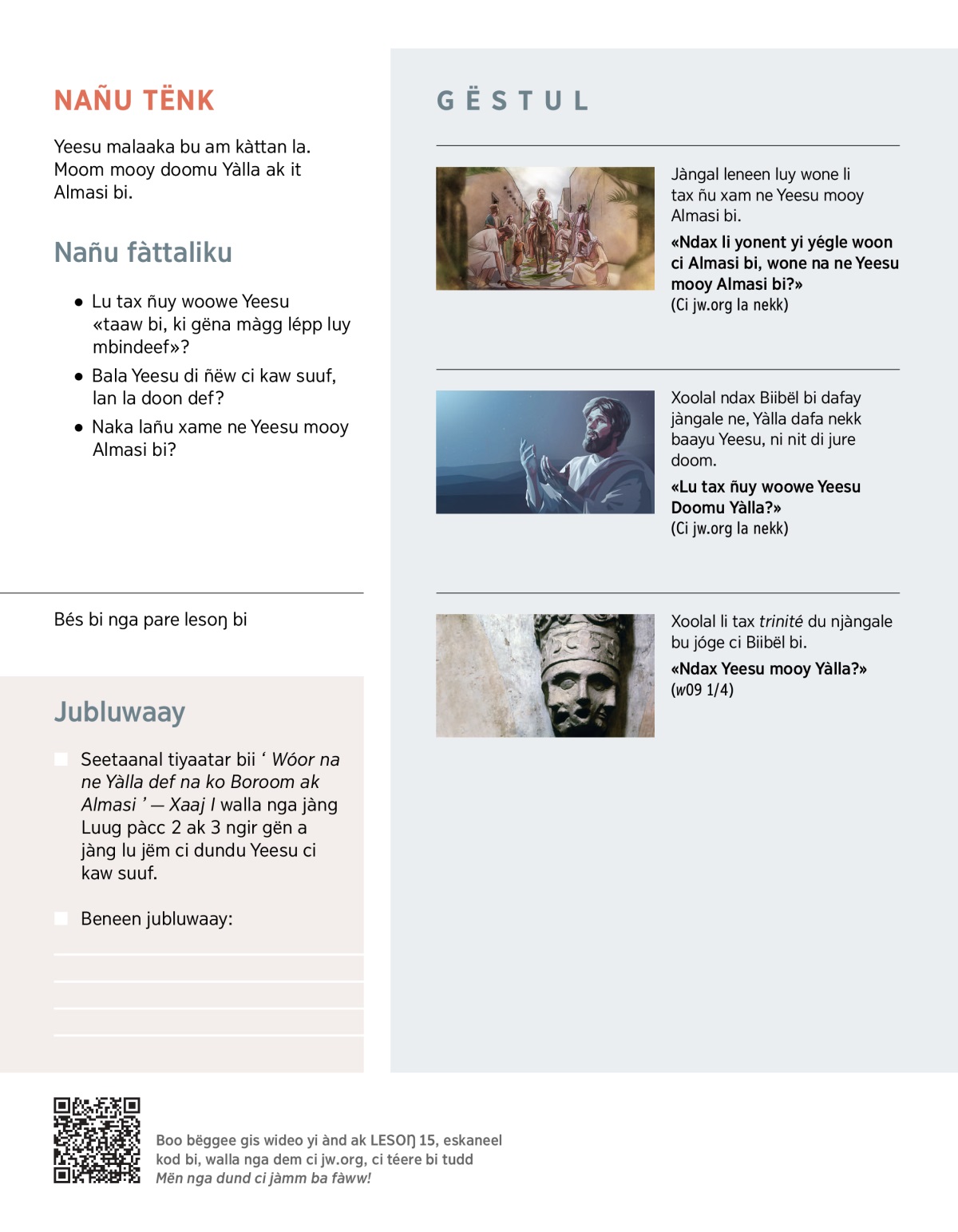 Aaya yii di topp dinañu ñu dimbali ñu xam li wuutale Yexowa ak Yeesu. Jàngal aaya yi, boo pare nga tontu ci laaj yi.