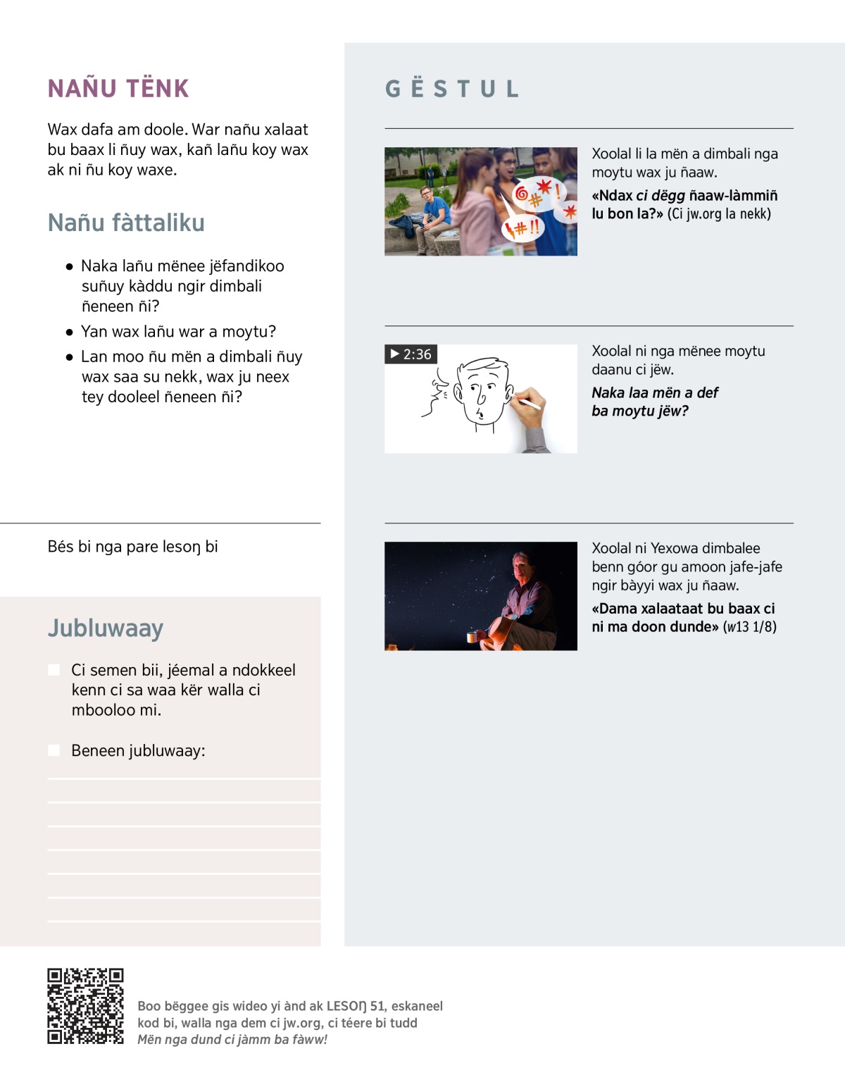 Jàngal Kàdduy Waare 7:16. Boo paree, nga tontu ci laaj bii di topp:
