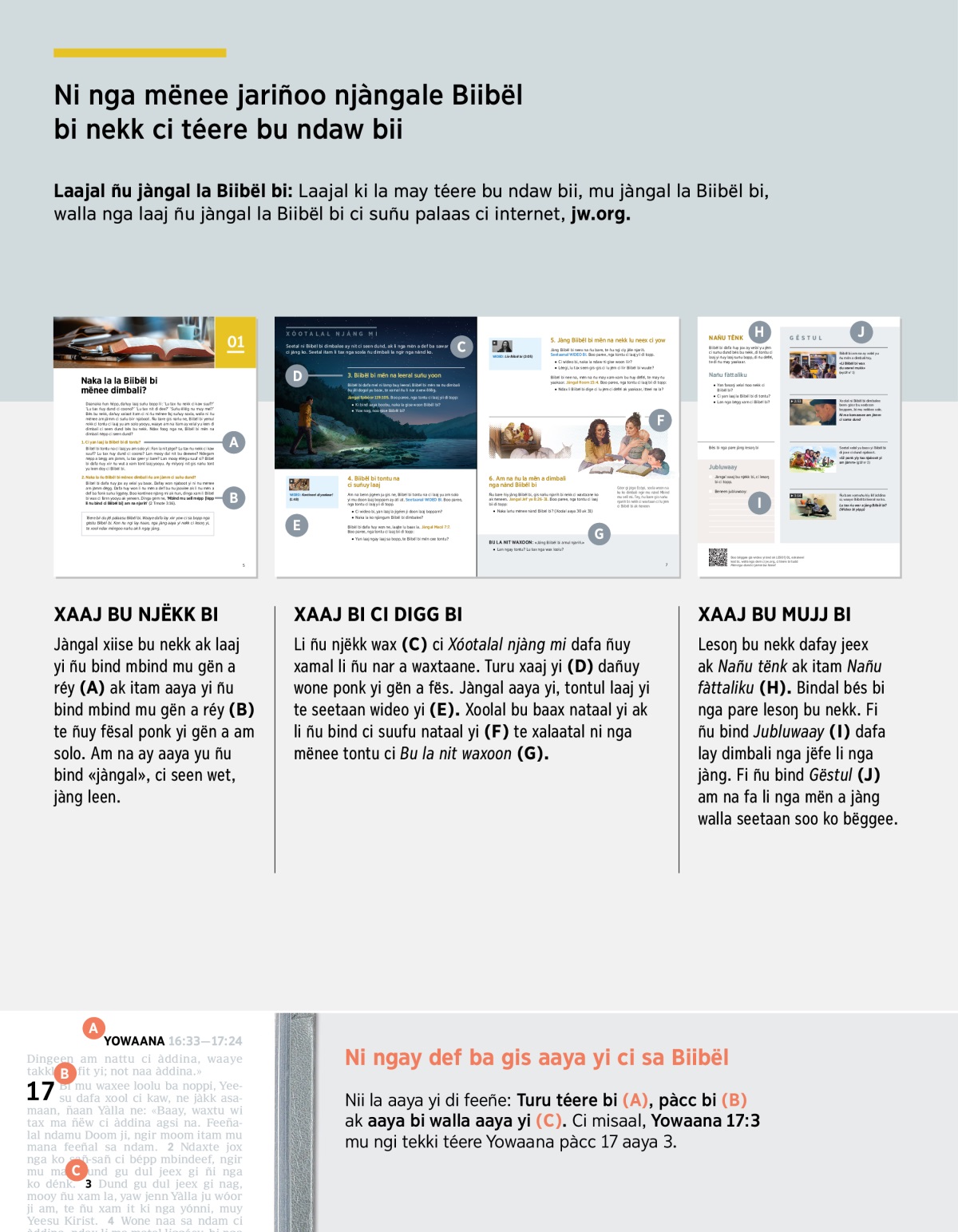 Laajal ñu jàngal la Biibël bi: Laajal ki la may téere bu ndaw bii, mu jàngal la Biibël bi, walla nga laaj ñu jàngal la Biibël bi ci suñu palaas ci internet, jw.org.