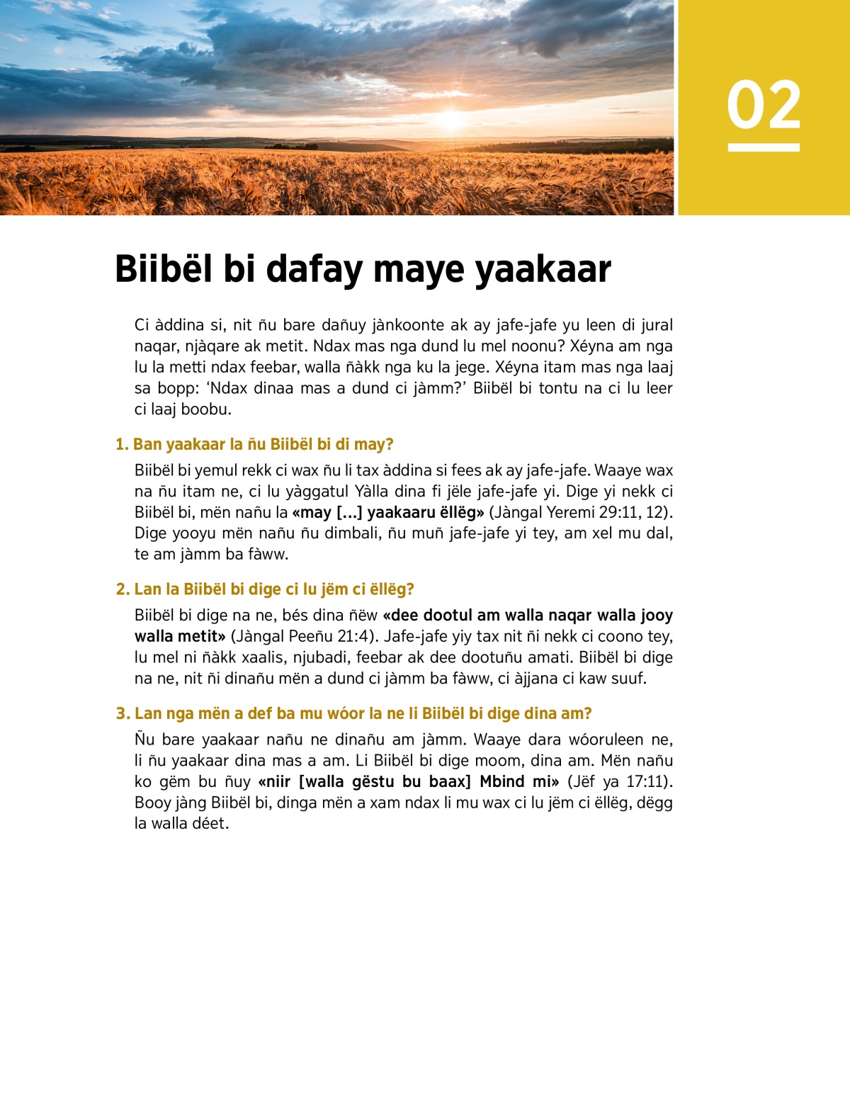 Biibël bi yemul rekk ci wax ñu li tax àddina si fees ak ay jafe-jafe. Waaye wax na ñu itam ne, ci lu yàggatul Yàlla dina fi jële jafe-jafe yi. Dige yi nekk ci Biibël bi, mën nañu la «may [...] yaakaaru ëllëg» (Jàngal Yeremi 29:11, 12). Dige yooyu mën nañu ñu dimbali, ñu muñ jafe-jafe yi tey, am xel mu dal, te am jàmm ba fàww.
