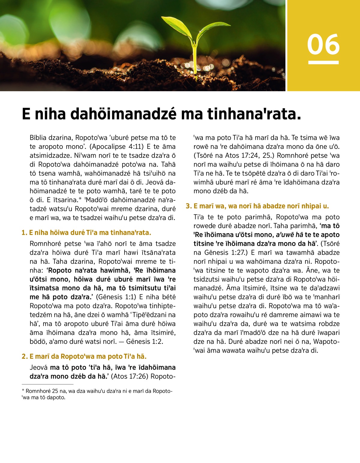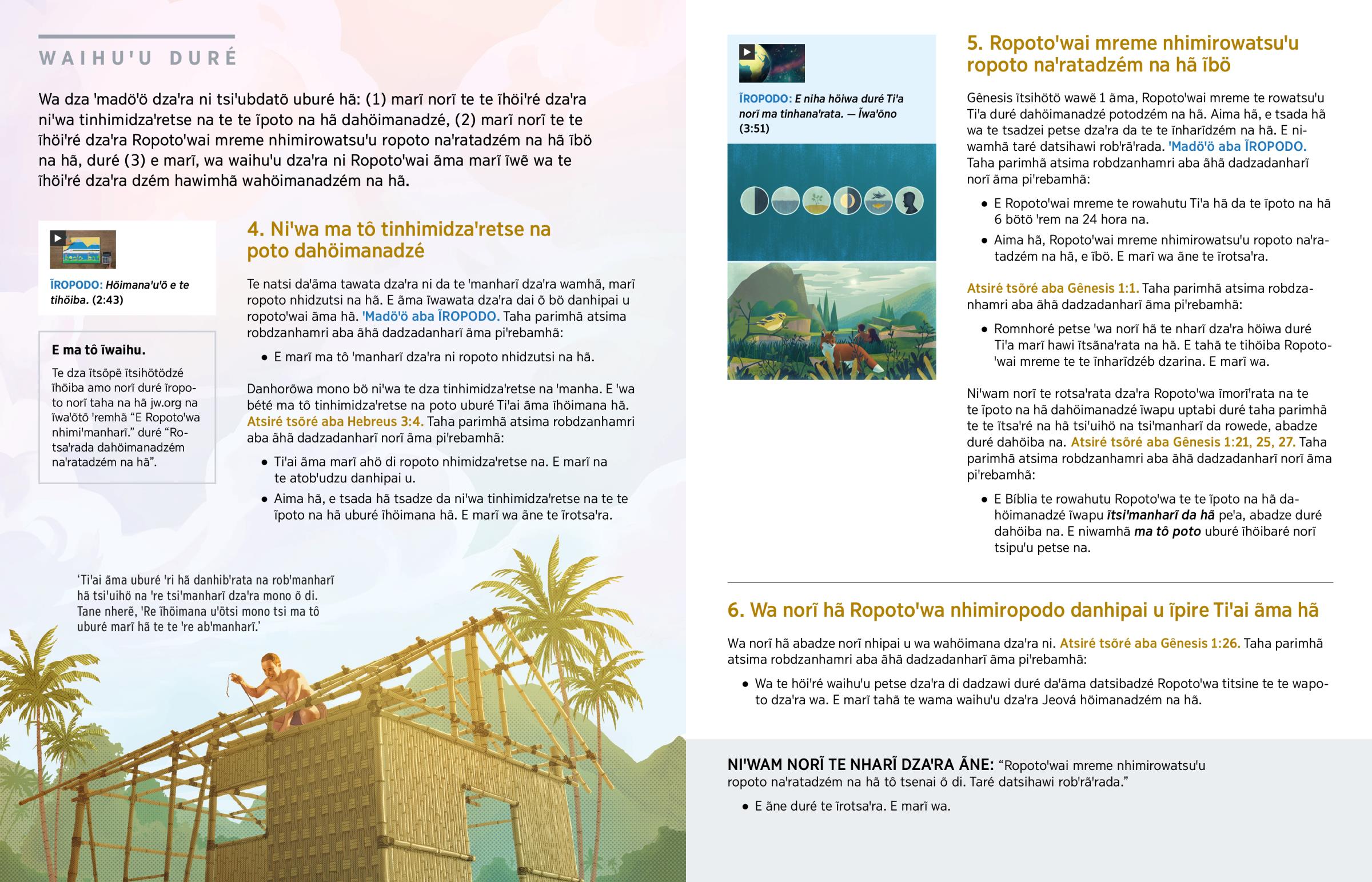 Romnhoré petse ꞌwa ĩꞌahö norĩ te ãma tsadze dzaꞌra höiwa duré Tiꞌa marĩ hawi ĩtsãnaꞌrata na hã. Taha dzarina, Ropotoꞌwai mreme te tinha: ‘Ropoto naꞌrata hawimhã, ꞌRe ĩhöimana uꞌötsi mono, höiwa duré uburé marĩ ĩwa ꞌre ĩtsimatsa mono da hã, ma tô tsimitsutu tiꞌai me hã poto dzaꞌra.’ (Gênesis 1:1) E niha bété Ropotoꞌwa ma poto dzaꞌra. Ropotoꞌwa tinhiptetedzém na hã, ãne dzei õ wamhã ‘Tipẽꞌẽdzani na hã’, ma tô aropoto uburé Tiꞌai ãma duré höiwa ãma ĩhöimana dzaꞌra mono hã, ãma ĩtsimiré, bödö, aꞌamo duré watsi norĩ. — Gênesis 1:2.