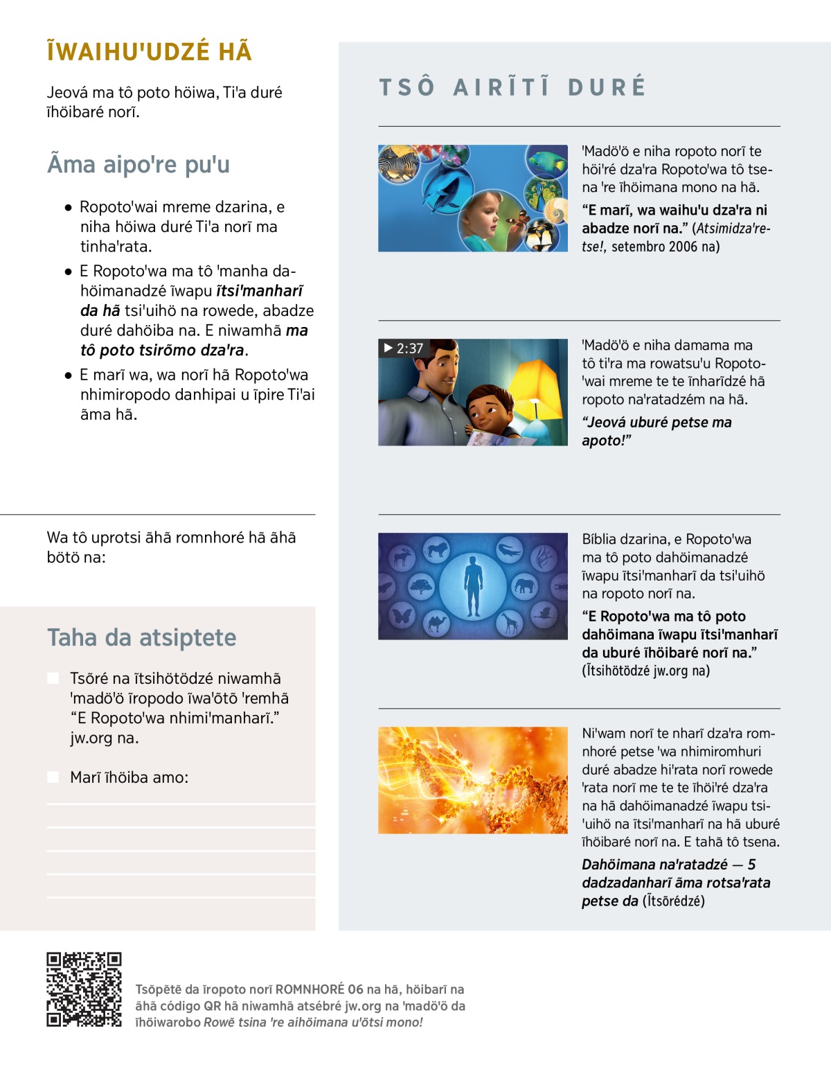 Te dza ĩtsõpẽ ĩtsihötödzé ĩhöiba amo norĩ duré ĩropoto norĩ taha na hã jw.org na ĩwaꞌõtõ ꞌremhã “E Ropotoꞌwa nhimiꞌmanharĩ.” duré “Rotsaꞌrada dahöimanadzém naꞌratadzém na hã”.